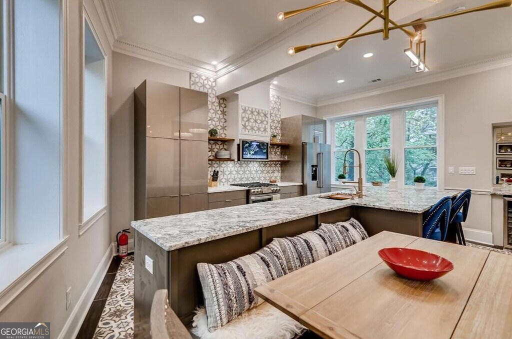 Located in Midtown on Piedmont Park, this fully furnished property presents an opportunity to experience luxurious living in a meticulously maintained home. The living room is designed as a haven, featuring a fireplace that serves as a focal point for relaxation and gathering, complemented by the high ceiling and crown molding, which together create an atmosphere of refined comfort. In the kitchen, culinary dreams become reality with stone countertops providing ample workspace, a high-end range oven for creating memorable meals, and a high-end refrigerator to keep ingredients fresh; the kitchen bar and kitchen island offer additional space for preparation or casual dining, while the wine cooler ensures your favorite vintages are always perfectly chilled, further enhanced by a backsplash and crown molding. This residence offers three bathrooms and three bedrooms, providing private spaces for rest and rejuvenation. The open floor plan enhances the sense of space, allowing for effortless movement and interaction throughout the home. With 1492 square feet of living area, this home combines amazing design with top-tier materials to create a truly exceptional living experience. MLS ID 10678078