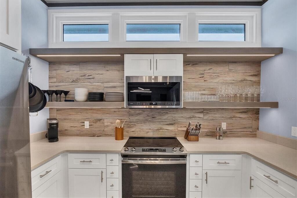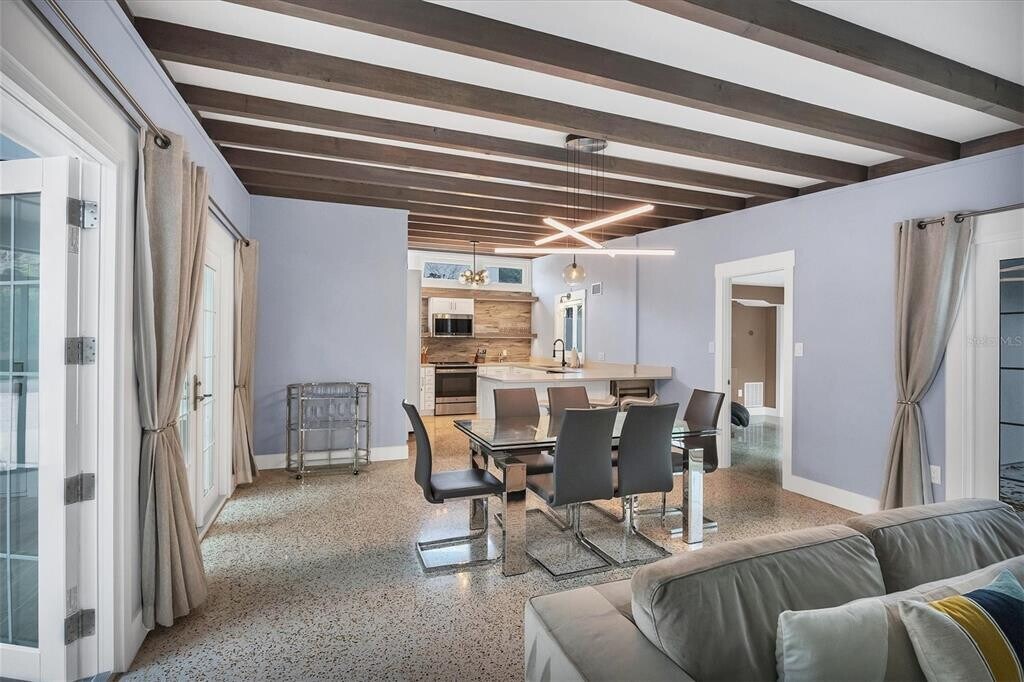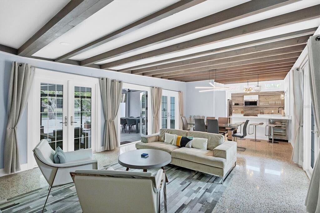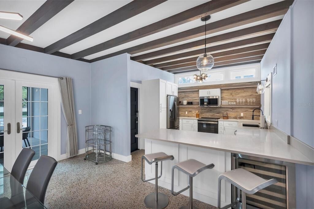 The Lido Shores Mango Retreat. This stylish home is located in the heart of Lido Shores,just steps to the beautiful private white sand beaches and crystal blue waters of the Gulf of Mexico. Canopied by a lush mango tree,with a tranquil and tropical setting. Features,3/3,1 car garage,screened lanai & office. From the bright entry is a spacious dining room with an open-concept kitchen with countertop space and seating. Beyond the kitchen,is a spacious open dining and living area. The bedrooms are thoughtfully laid out to preserve privacy and ensure plenty of room with private baths. The largest suite has a queen bed,and a dedicated office with a comfy chair & TV. The front bedroom has a king bed and welcomes light from a set of French doors that open directly to the screened Lanai. The third bedroom has a queen bed and access to the guest bath. MLS# A4613694