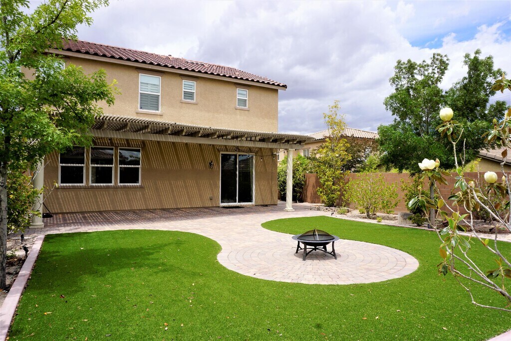 Fabulously Highly upgraded house in Kingwood/Summerlin with 2 story 3 bedroom, 2.5 baths. Kitchen W/Granite counter & drop lighting over island, built-in oven & microwave, stainless steel appliance, custom soft close cabinets & roll-out shelves. Enjoy natural light in the Kitchen and guest bathroom. Hardwood flooring throughout the first floor. Oversize lot & covered patio in the back yard, paving stone in the driveway and back yard. Welcome to see. No Pet Beautifully upgraded two-story home located in a desirable area in Kingwood/Summerlin. This property features 3 bedrooms and two bathrooms. The main living area offers an open-concept layout with wood-look flooring, creating a spacious and inviting atmosphere. The kitchen is a true highlight, designed with a granite countertop, a large center island, stainless steel appliances, and stylish pendant lighting. The custom decorative glass pantry door adds a touch of sophistication, and modern fixtures throughout the space. The open dining and living area provides plenty of room for entertaining—an upgraded interior with an elegant wrought-iron staircase and warm, plush carpeting leading to the second floor. Spacious, beautifully landscaped backyard featuring a large area of lush synthetic grass and a dedicated patio circle, perfect for outdoor seating or a fire pit. Front and backyard, including professionally installed pavers. Conveniently located minutes from school, near the 215 freeway, community parks, shopping, and restaurants. Providing excellent accessibility and a convenient lifestyle - an ideal choice for you seeking a quality living experience in Summerlin.
