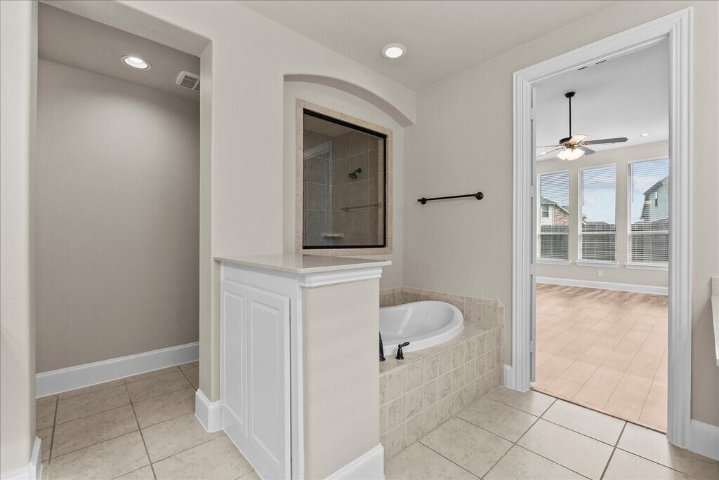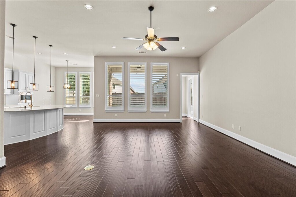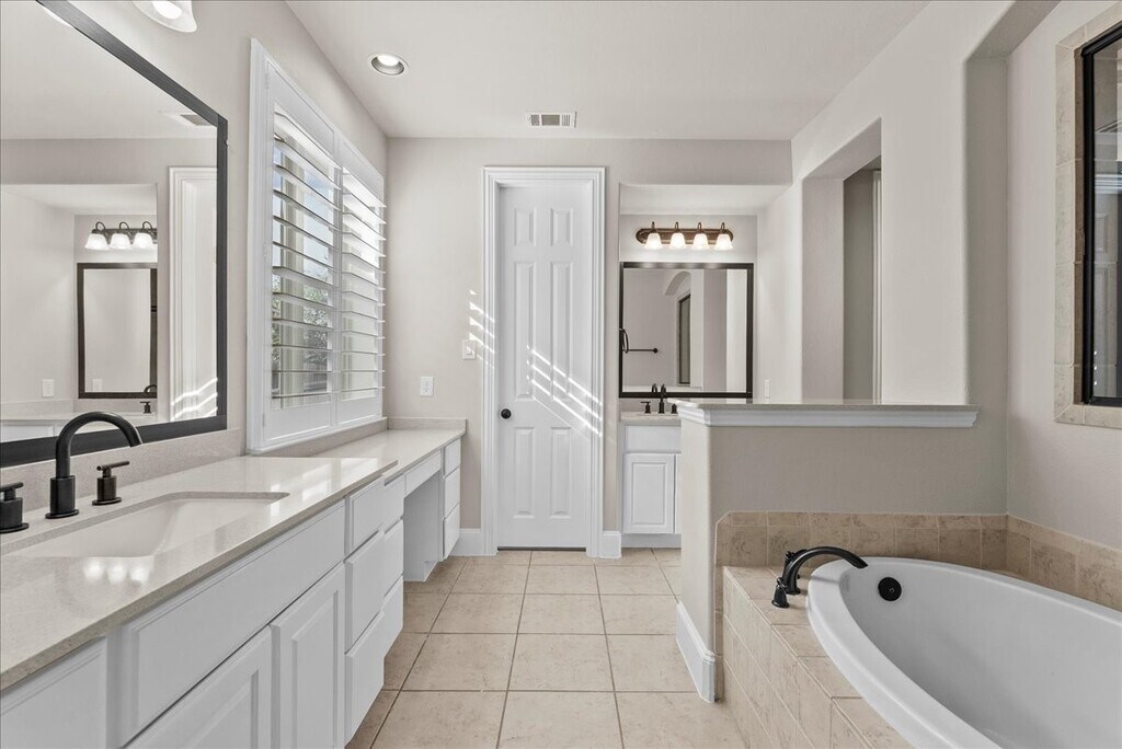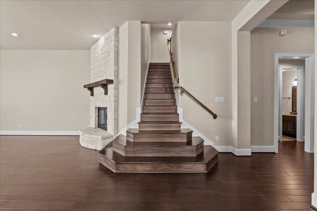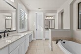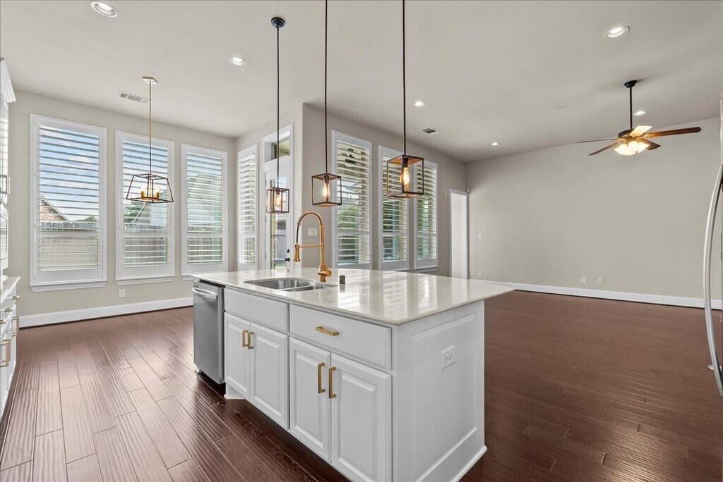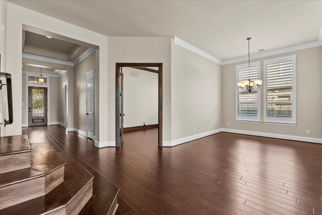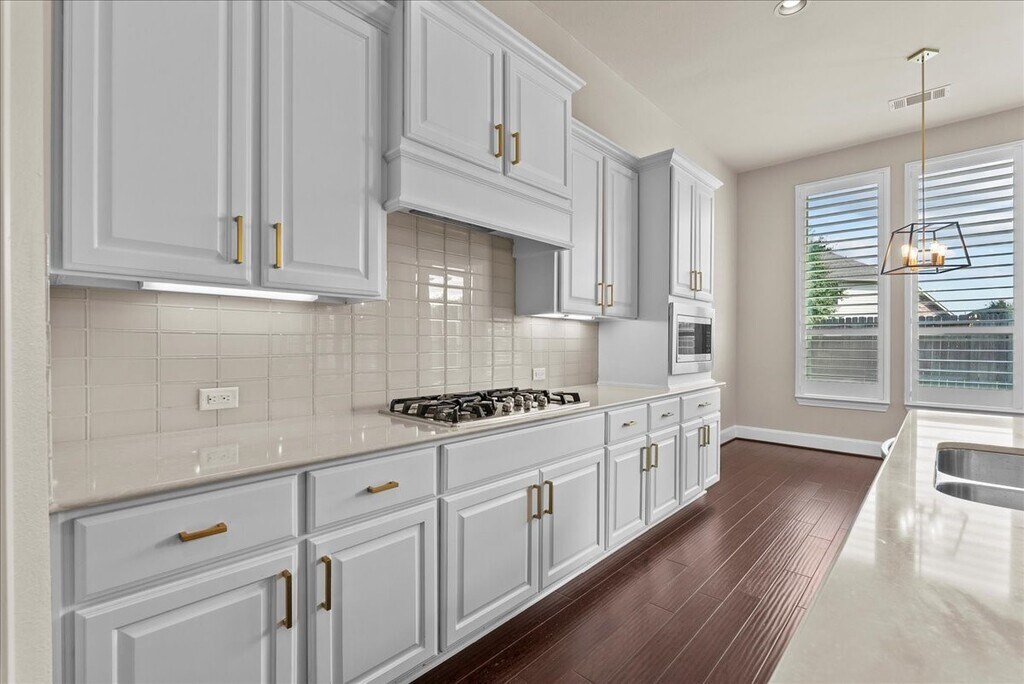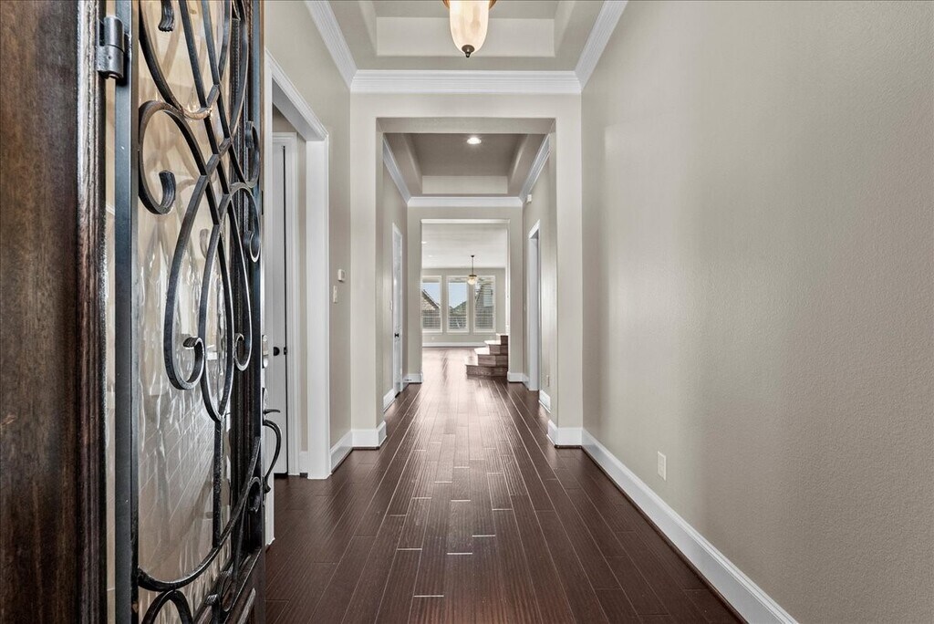 This exquisite home features crown molding,plantation shutters,hardwood floors,fresh designer paint,and elegant lighting throughout. The heart of the home is a cozy open-concept kitchen,living,and dining combo,complete with gas cooktop,double oven,and abundant cabinetry. The private primary retreat offers double sinks,oversized vanity,spa-like tub,separate shower,and a massive walk-in closet. A second downstairs primary adds versatility,while all bedrooms feature walk-in closets. Upstairs,a spacious media/game room can serve as a sixth bedroom. Enjoy outdoor entertaining on the covered patio surrounded by lush landscaping. With an EV charger in the garage and just minutes from top schools,H-E-B,parks,trails,fine dining,and I-45,this meticulously maintained residence truly has everything you need and more—luxury,comfort,and lifestyle in one. MLS# 54796783