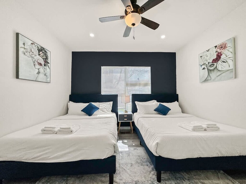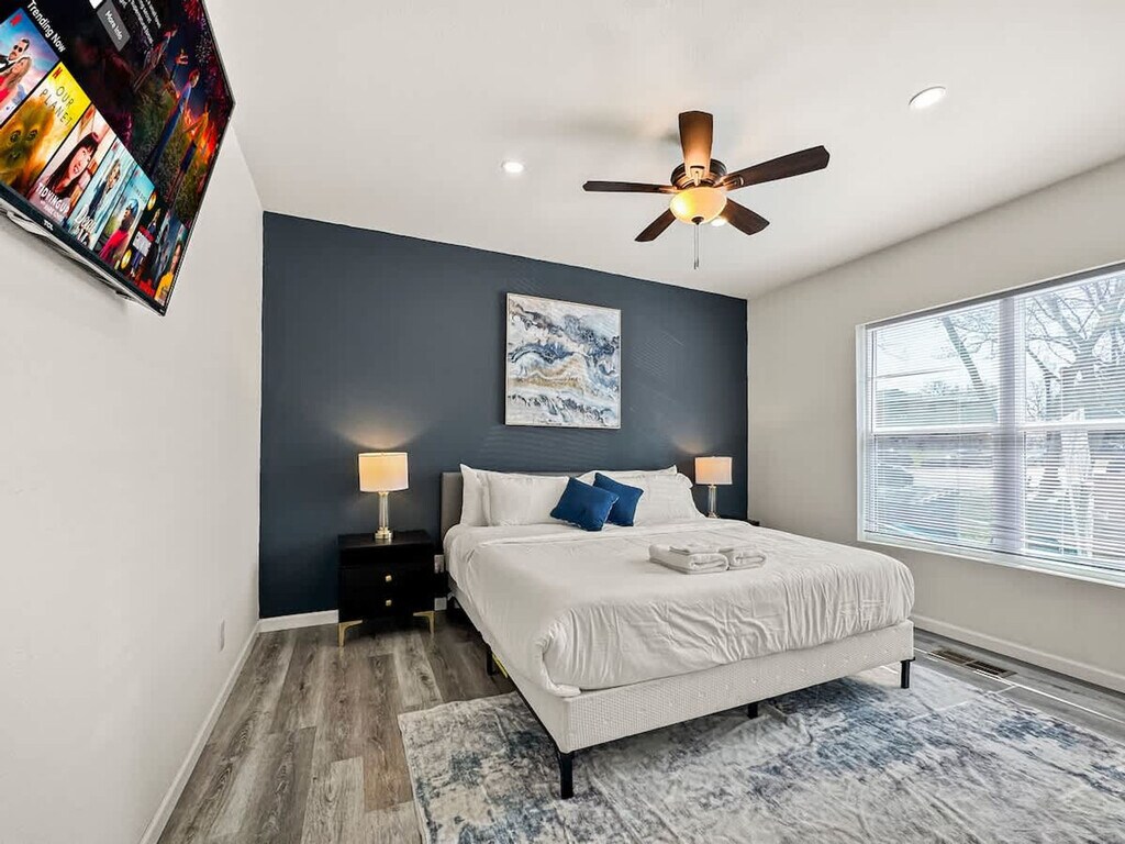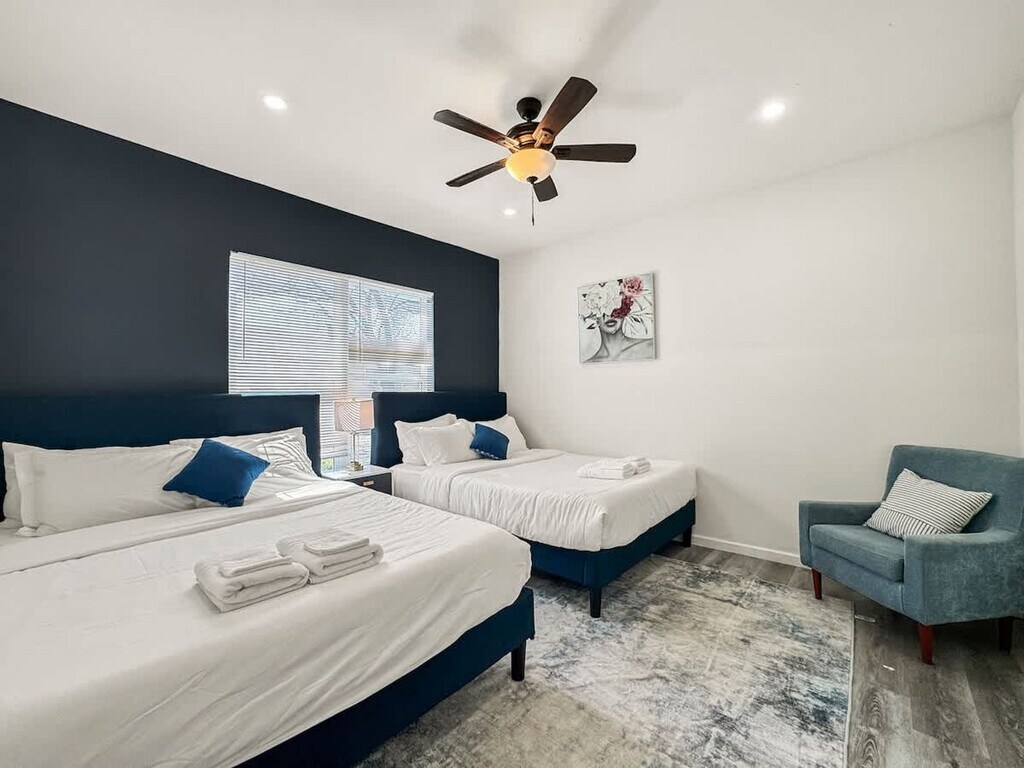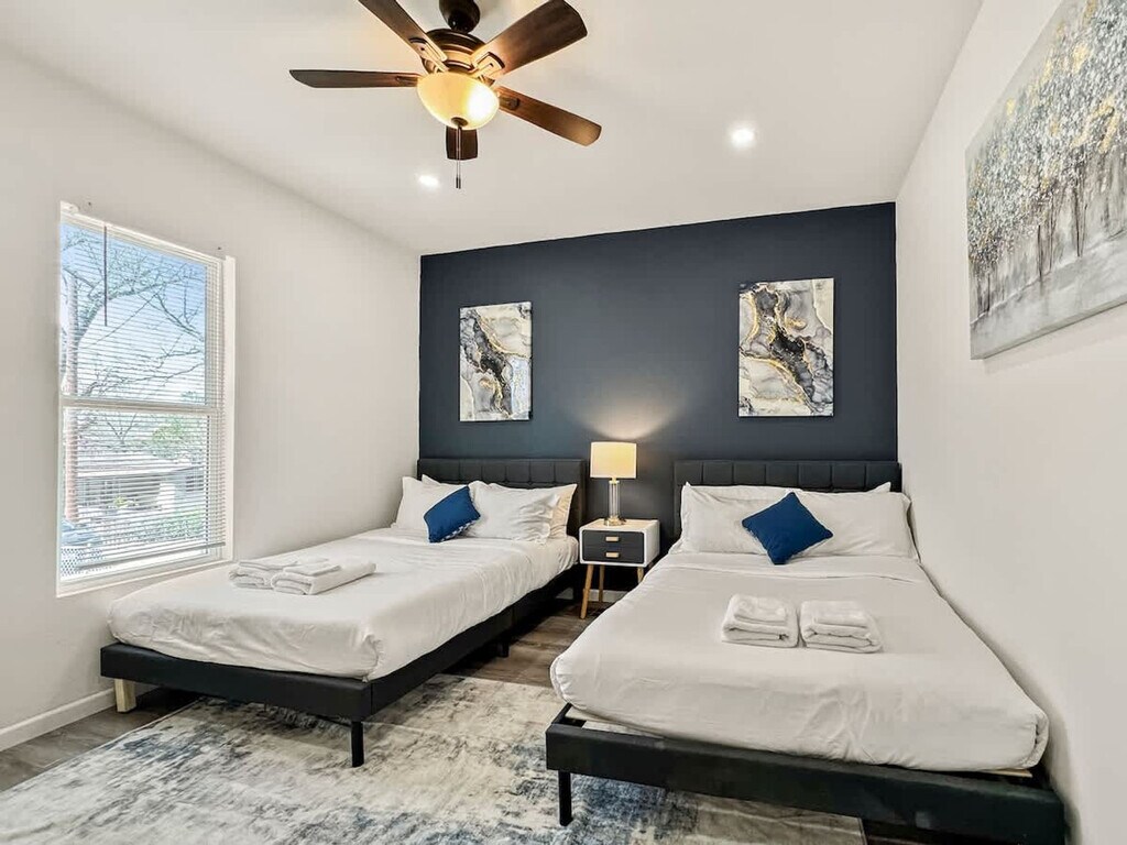 Your search ends here—this is the ideal spot for your stay in Dallas. Impeccably clean and roomy, this stylish 3-bedroom, 2-bathroom apartment offers plush King and Queen beds for a restful sleep. Enjoy the game room for entertainment and make unforgettable memories, day or night. The open-concept living and dining space is tastefully furnished with contemporary decor and ample lighting. Expansive glass windows flood the space with natural light, complemented by warm wooden floors for a cozy ambiance. Each bedroom provides a peaceful escape with charming nighttime views. The fully equipped kitchen ensures effortless meal preparation with modern appliances and all necessary cookware. Experience the best of Dallas from this inviting apartment. Conveniently located, it offers easy access to local attractions and amenities, making it perfect for group getaways with family or friends. Your health, safety, and comfort are our top priorities, with strict cleaning protocols followed after every stay. Guest verification is required before your stay, which may involve submitting a government-issued photo ID and completing verification through our portal. All guests must sign a rental agreement outlining the terms of their stay. Hallway surveillance cameras are in place, and a Minut device is installed in the unit to monitor noise levels. [SI]