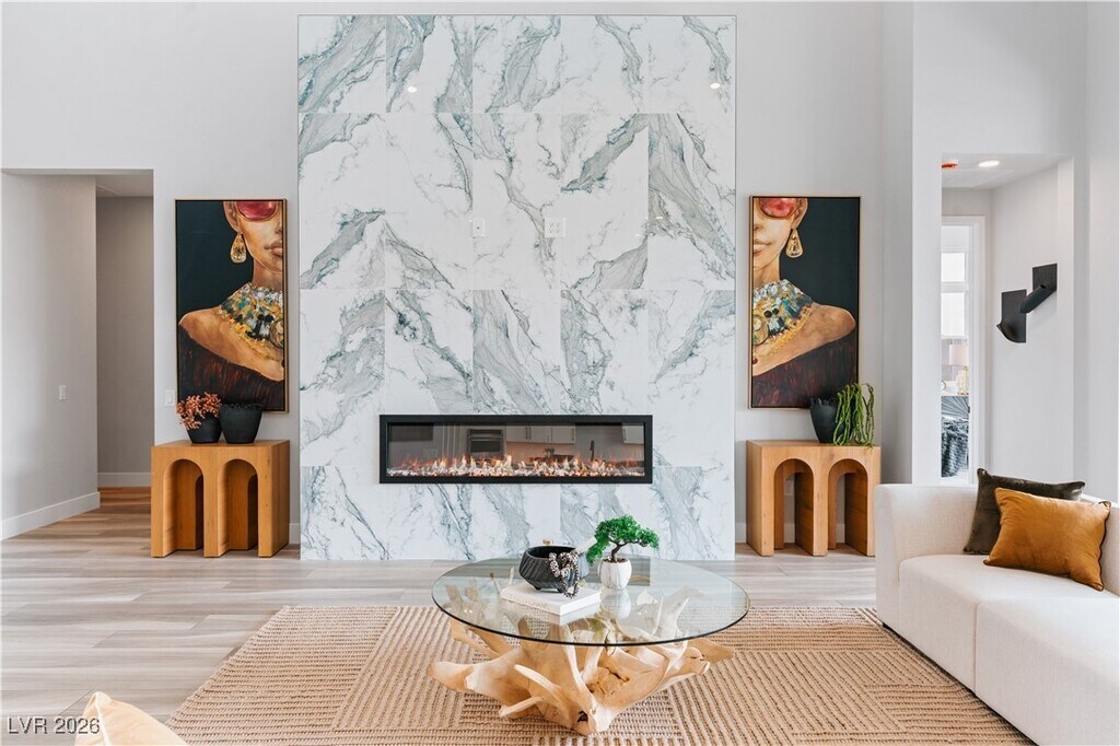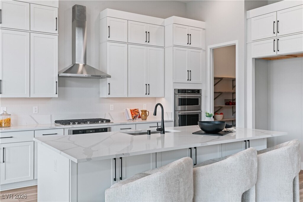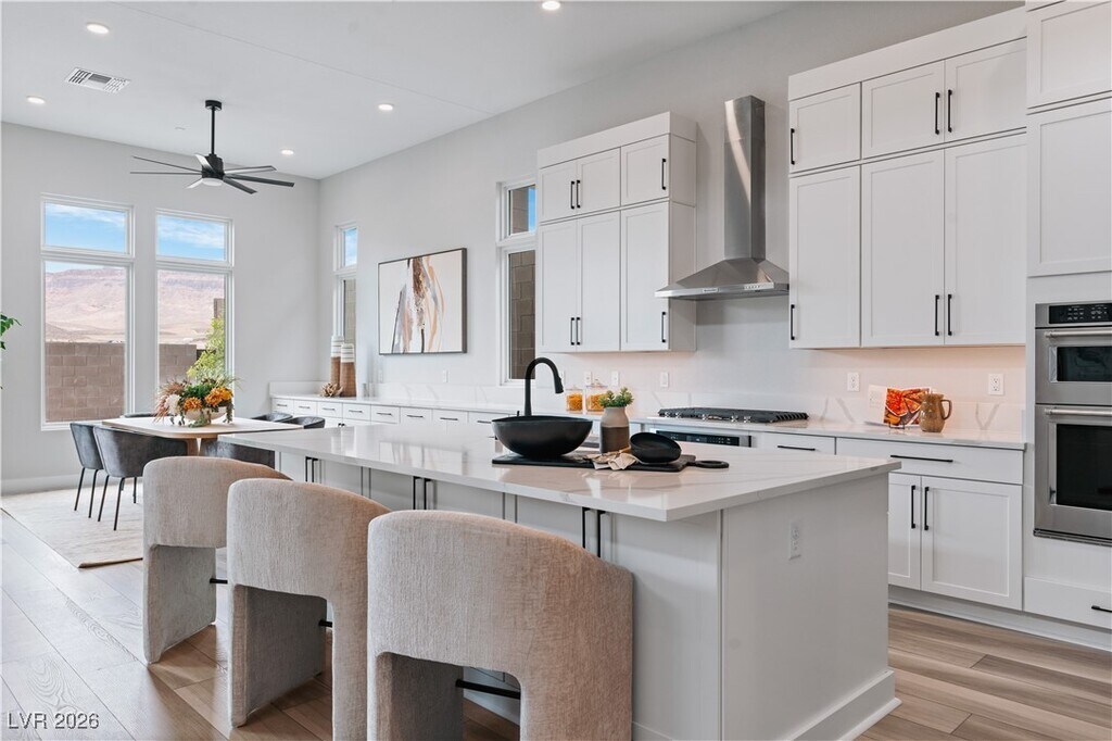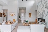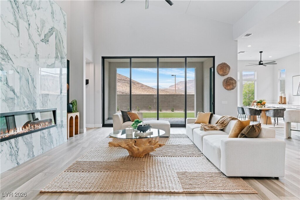 This property is BRAND NEW AND NEVER LIVED IN! Located in Ascension, Summerlin's newest premier guard gated community adjacent to The Summit; surrounded by golf courses, pristine parks, top ranked schools, jogging trails and the finest shopping, dining and entertainment Las Vegas has to offer! Property features oversized kitchen island, quartz counters, extended buffet cabinets plus uppers, built-in Kitchen-Aid appliances, soaring vaulted ceilings, custom built-in fireplace wall, luxury vinyl plank flooring, ceiling fans through-out, 10 ft collapsible panel sliding glass doors that opens to 20X13 covered patio for true indoor/outdoor living and all on an elevated homesite offering majestic mountain views. Ascension's Clubhouse will feature resort style pools & spas, pickleball courts, state of the art fitness center, golf simulator and social venues.