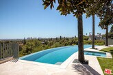 Museum Modern on an exceptional Beverly Hills Promontory. Panoramic views from Ocean to Downtown. No roof tops or obstructions. Exceptional scale with soaring ceilings. Walls of glass frame the jetliner views. Over 7,500sqft. Primary suite is on par with world-class hotel with double baths and vast closets. 3 additional bedrooms. Major infinity edge pool wraps a vast terrace for entertaining. One of a kind, in a most prime location. MLS# 25611369