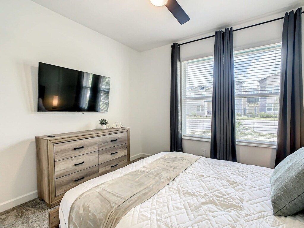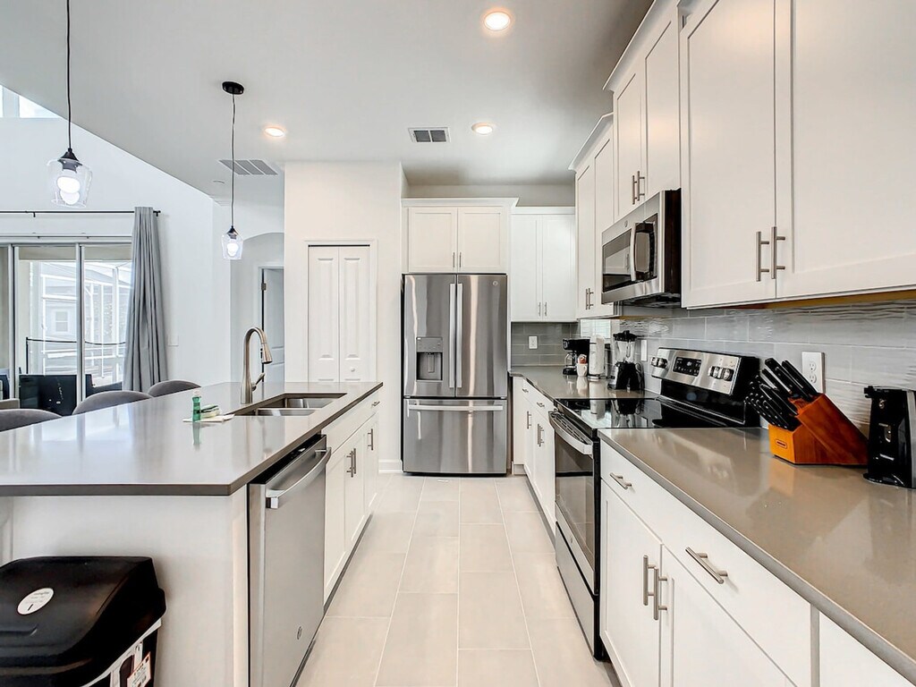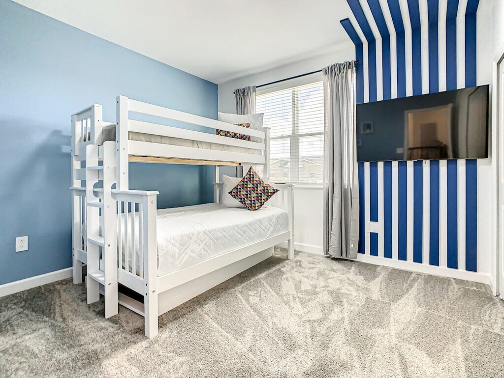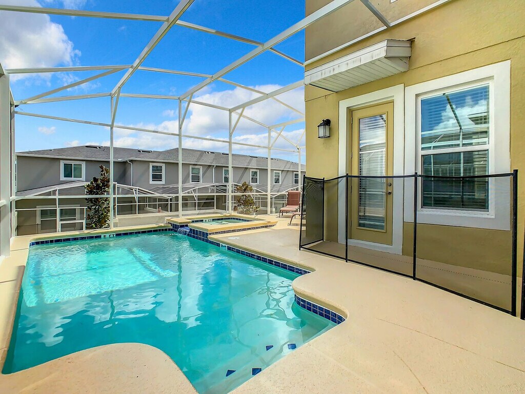 Experience the excitement of the new Epic Universe park just minutes away from this luxurious vacation home. This property offers unbeatable comfort with a private pool and Jacuzzi, a fully equipped kitchen, and a spacious living area. Enjoy the convenience of a garage and free street parking, along with high-speed internet and smart TVs throughout the home. The first floor features a king-size bedroom with a private bathroom, a queen-size bedroom, and a shared bathroom. The second floor includes a bunk bed room, a room with two queen-size beds, and a master bedroom with a king-size bed and en-suite bathroom. A queen-size sofa bed is also available. Indulge in full complimentary access to the resort's amenities, including a gym, heated swimming pools, a lazy river, a water park, and more. The main clubhouse is a short 7-minute drive away, offering additional facilities like a spa, golf, and a family cinema, some of which may incur extra fees. The property itself is equipped with essentials such as bed linens, hair dryers, ironing supplies, and a washer/dryer. Optional services are available for an additional cost, including a pack and play, high chair, early check-in, and late check-out. Enjoy unlimited access to two luxury clubhouses and a private pool and Jacuzzi, though the Jacuzzi is not heated. Additional fees apply for certain resort amenities like the spa and golf. Located in a prime area, this property is close to major attractions such as Sea World, Universal Studios, and Disney World, all within a short drive. Nearby, you'll find shopping outlets, supermarkets, and a variety of dining options. Transportation is convenient with Uber and Lyft services available, and several medical facilities are within easy reach. Guests must be at least 18 years old to book a reservation. The property is strictly for vacation use, and no unregistered guests, smoking, or pets are allowed. Check-in is keyless, with codes provided prior to arrival. A safety protocol is in place to ensure the well-being of guests and staff. A $2,000 security deposit is required for stays of 28 days or more, refundable upon check-out if no damage or deep cleaning is needed. The property features high-speed internet and multiple smart TVs, making it ideal for remote work or entertainment. A laptop computer is not included. [SI]