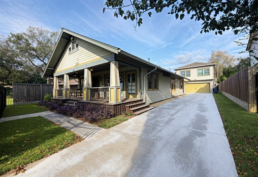 Move-In Ready,fabulous reimagined Heights 2-bedroom,2-bath 1928 bungalow for RENT. No carpet— engineered cherry wood floors flow throughout the living spaces. Chic wood-burning fireplace,sunroom/flex space,and formal dining/living areas. Updated island kitchen flaunts granite counters,gas cooking,stainless appliances,and abundant custom cabinets,shelves,and drawers highlighted by pendant lighting. Bathrooms are gorgeously updated with designer tile; primary ensuite bath includes a rain shower head tub/shower combo. Convenient in-house laundry,plus WASHER/DRYER/FRIDGE INCLUDED! Exclusive use of the backyard/deck,and 2-car garage w/ motorized driveway gate and wrought iron fencing for privacy and security. (Above garage apartment is leased). Unbeatable Heights location—steps to Mutiny Wine Room,walking distance to Stude Park,bike trails,breweries,and local eats,with quick access to Studemont and I-10. Schedule today—come live where you work and play! No smokers/pets. MLS# 52724421