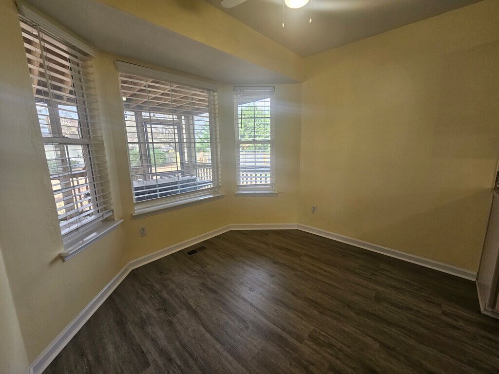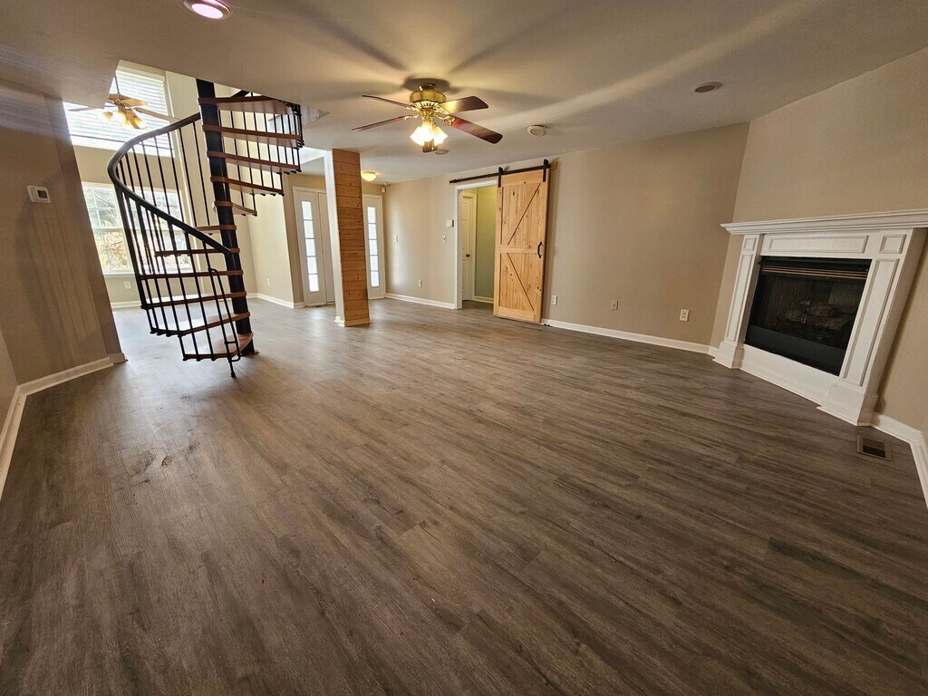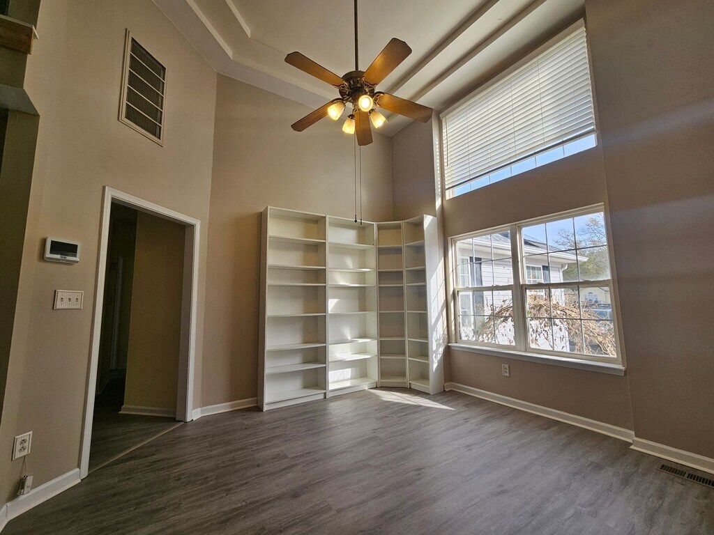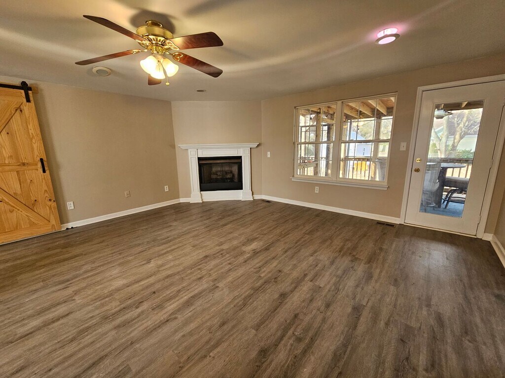 Welcome home! This beautiful property features a first-floor primary suite complete with a double vanity, jetted tub, and walk-in closet. Two additional bedrooms and a full bath are also located on the main living level. The open family room offers a cozy gas fireplace and flows into the formal dining area, which features a vaulted ceiling and built-in cabinetry. The updated kitchen includes a pantry and space for a small table, perfect for entertaining. Upstairs, you'll find a versatile bonus space with a private entrance—ideal for a college student, home office, or guest suite. This area includes a sitting space and a full bathroom. Outdoor living is a highlight with a large screened-in porch, fenced yard, and a spacious storage shed, plus a two-car garage. The home features all new paint and flooring throughout. Solar panels to reduce your electric bill. Pets are welcome with a deposit. Residents also enjoy access to a neighborhood boat ramp and picnic area. Available at the end of December.