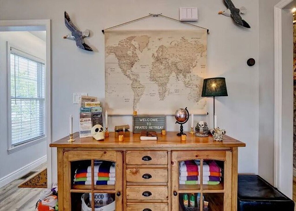 AVAILABLE DECEMBER-FEBRUARY Pirates Retreat – Entire Home & Outdoor Oasis Ahoy Matey. Has a gruelin' life o' piracy got ye down? Are ye ready t' escape t' tiki bars 'n white sand beaches? Then set course fer Pirate's Retreat – a sweet retreat for yer salty feet! A much-needed escape for the whole family; this pirate-themed 2 story home is minutes from the best that Carolina Beach has to offer. Enjoy your beach vacation with a charming twist, each room has a unique vibe and theme to take your vacation from ordinary to extraordinary. The large backyard is a buried treasure: A completely fenced-in yard that boasts a natural wood fire pit, grill island, outdoor dining areas, outdoor shower, string lights, and palm trees all around your retreat. A multi-level deck & patio make outdoor living a delight. We invite you to stay and make Pirates Retreat your home away from home. Right behind Berts Surf Shop and across the street from Hoplite Irish Pub, walk to the beach, the canal, grocery stores, shopping, and restaurants. Dogs and cats are allowed! Feel free to bring yer salt-lovin’ pup on your adventure. Your stay includes access to an oversized crate, 1 large and 1 small pet bed, and an outdoor dog run with the full-enclosed backyard. You'll sleep like the ship’s captain in our large master bedroom and your mateys can bunk upstairs in either the kids’ room or the guest room. Don't wait, our beautifully tended home awaits your island visit! Secure your stay for a monthly off-season rate starting after Labor Day and available through mid-May of 2026. Are you ready to secure your spot for your '25-'26 winter escape? **Contact Ann at Sea Coast Rentals at for further information on our off-season furnished rentals and/or to check available dates. Check out all our rentals: both off-season/furnished and long-term at