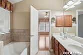 Live in a beautiful former model home nestled in highly desired Villas at Canyon Springs! This elegant single-story home offers 3 bedrooms + 2 bathrooms. The spacious open-concept floorplan with high ceilings flows seamlessly for easy entertaining. Designed for both style and convenience, the home features no carpet throughout - luxury laminate and ceramic tile only. The sleek kitchen boasts stainless steel appliances. Relax in the primary in the large primary bedroom with a large walk-in closet and a shower, garden tub and double vanities. The backyard opens to tranquil golf course views, providing exceptional privacy. Residents enjoy access to resort-style amenities including a community pool, park, playground, tennis courts, and basketball courts in this gated community. Conveniently located to plenty of shopping, dining and major highways and zoned in highly rated Comal ISD schools including Specht Elementary, Pieper Ranch Middle and Pieper High School. A rare lease opportunity combining comfort, scenery, and lifestyle. Schedule your showing today!