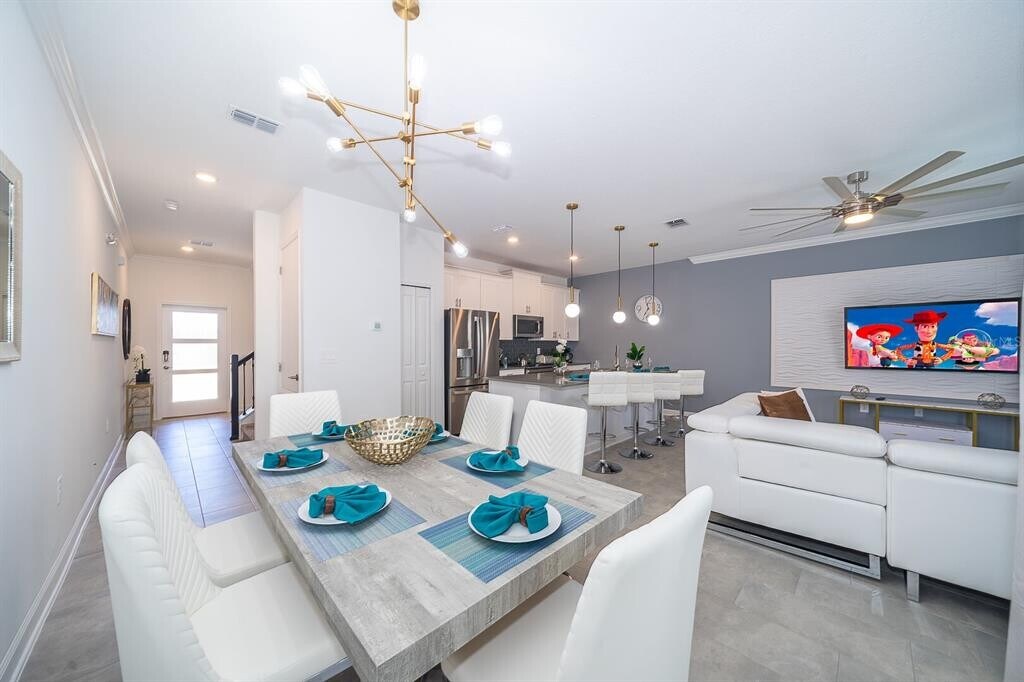 Leave your dream townhouse in Champions Gate!,this stunning fully furnished 4-bedroom,3-bathroom home perfectly blends modern comfort and contemporary style. The open-concept kitchen features sleek finishes,stainless steel appliances,and a spacious island,flowing seamlessly into bright and elegant living and dining areas — ideal for both relaxation and entertaining. Step outside to your private screened-in pool and patio,complete with a grill area for enjoying Florida’s sunshine with family and friends. Located within the gated Champions Gate community,this home offers resort-style living just minutes from Disney parks,with easy access to top-rated schools,supermarkets,restaurants,banks,and shopping. This home has it all. Don’t miss out — schedule your private tour today! MLS# S5138280