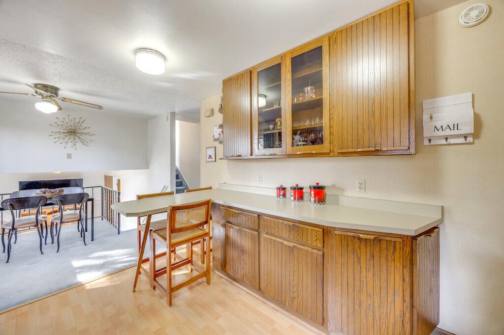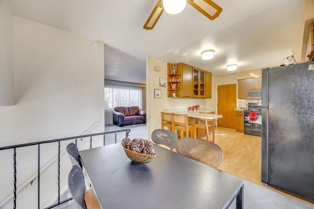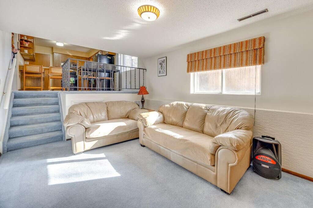 Feel at home in this 3-bedroom home in a peaceful area of Colorado Springs, with easy access to restaurants, shops, and outdoor spots. This multi-level home requires two steps to enter and interior stairs to access all bedrooms, which are on the second floor and basement floor. This home features two furnished living rooms with smart TVs, a four-person dining table, and high-top seating. The kitchen is equipped with a refrigerator, dishwasher, stove/oven, microwave, cooking basics, dishware, flatware, and a drip coffee maker. Additional amenities include free Wi-Fi, central air conditioning and heat, a washer and dryer, linens, and towels. The bathroom has a shower/tub combo and grab rails. Enjoy the furnished patio with a gas grill and a fenced backyard. Parking is available in the garage for two vehicles and in the driveway for two vehicles. Located five miles from downtown, this home offers easy access to attractions like Garden of the Gods, Fort Carson, and the Broadmoor. Smoking, pets, events, parties, and large gatherings are not allowed. Your safety matters. This property features one exterior security camera located above the garage, facing outward toward the driveway. It does not look into any interior spaces. The camera records video and sound when activated by motion. Additional fees and taxes may apply, and a photo ID may be required upon check-in. [SI]