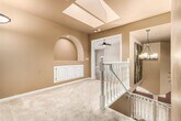 Gorgeous Home in Rio Montana with 5 bedrooms,soaring ceilings,wood floors,upgraded lighting,decorative columns,window blinds,& formal dining room. Neutral tiled floors,center kitchen island,granite counters,under-mount sink,breakfast bar,pantry,& white cabinets w/hardware. High-end karsten carpeting,interior laundry room w/sink,& storage cabinets. Generous sized bedrooms,skylights,art niche,ample closets,& upscale baths. Grand master retreat boasts a private balcony,fireplace,kitchenette,& spa-like en suite w/dual sinks. Extended patio with wet bar,ceiling fans,& fireplace. Sparkling diving pool,Gazebo,& desert landscape. Just minutes from top rated Basis and Desert Mountain schools