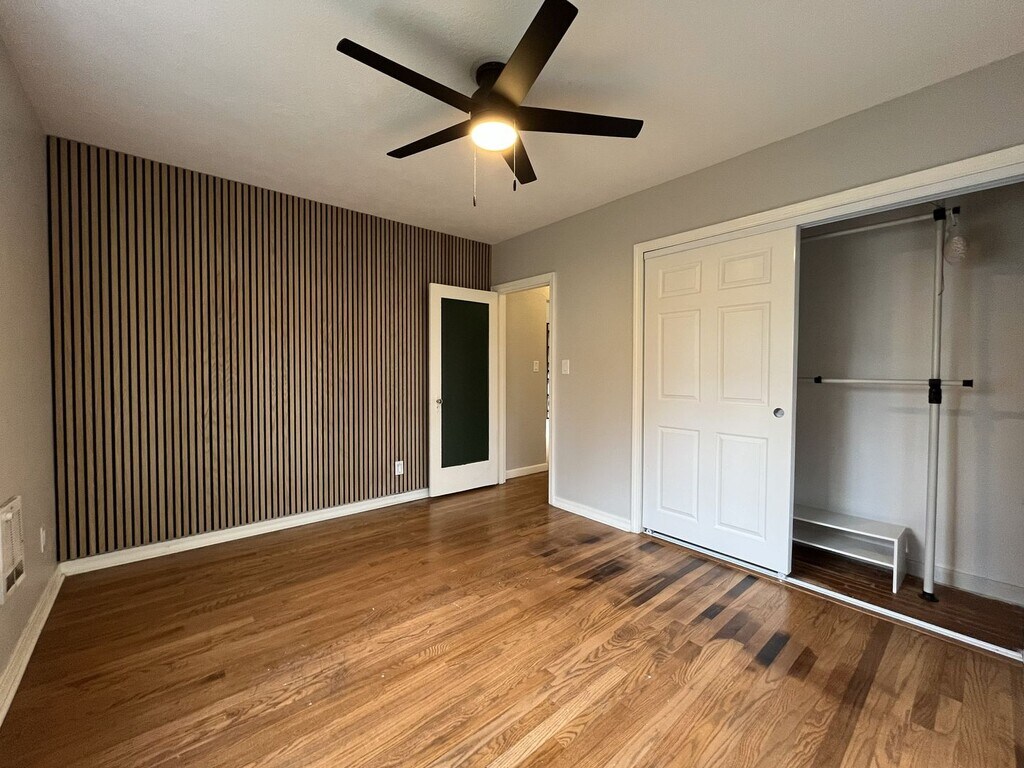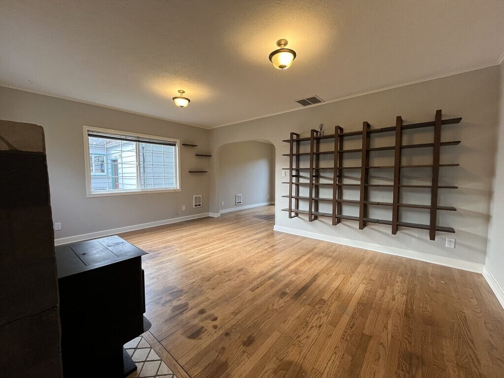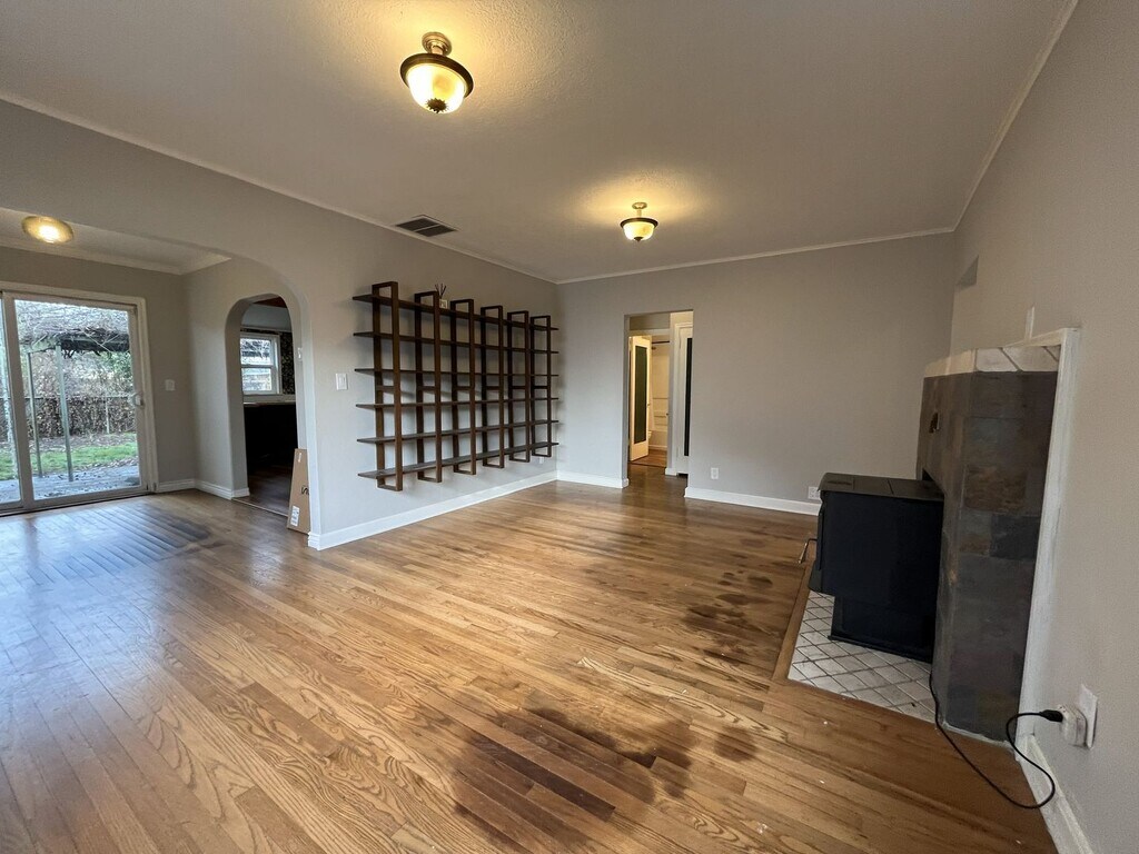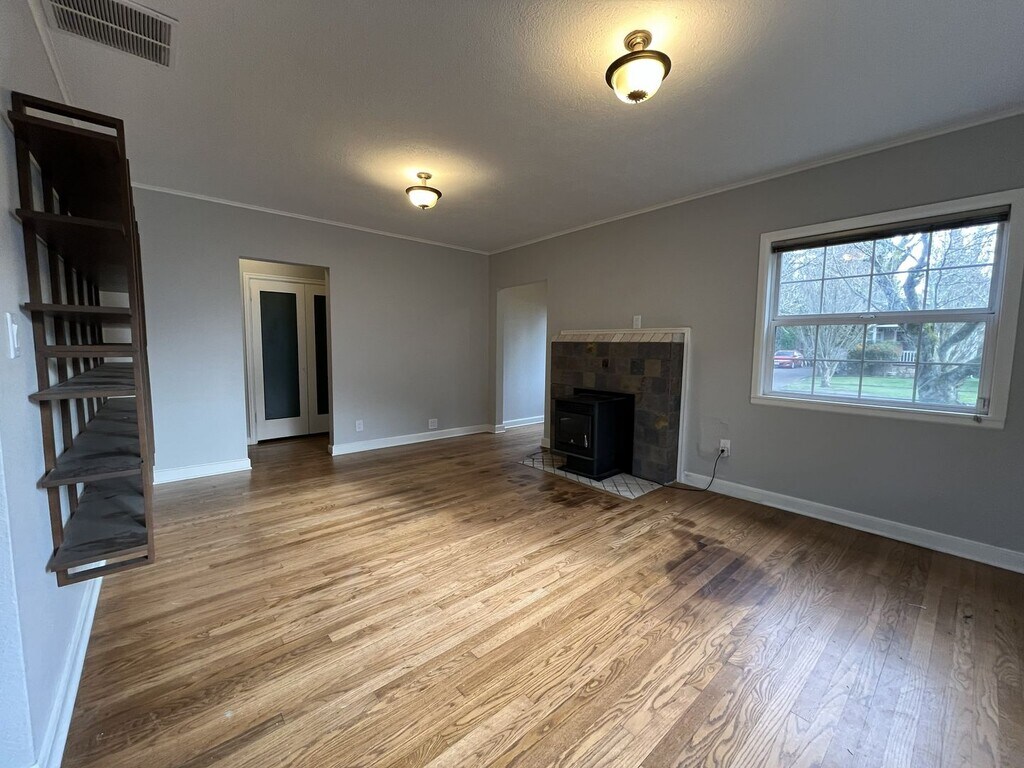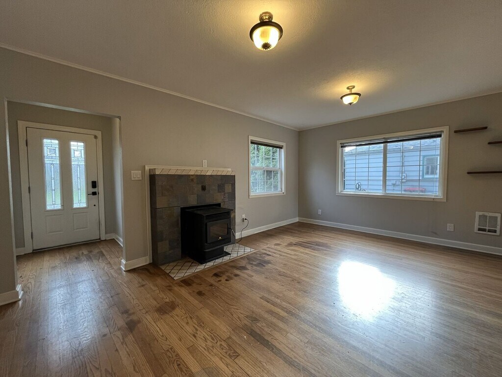 This charming single-level two bedroom, one bathroom home offers 1,282 square feet of comfortable living and thoughtful updates. The exterior features a spacious front lawn divided by a central walkway and framed by a privacy hedge. A raised wooden front deck creates an inviting setting for morning coffee or quiet outdoor lounging. Stepping through the entry, you are welcomed into the bright living room. This space features hardwood flooring throughout, a built-in fireplace, built in shelving, and windows along two walls that fill the room with natural light. Adjacent to the living area is a dedicated dining room with a sliding glass door leading to the exterior and a contemporary light fixture overhead. The kitchen is roomy and well-equipped, featuring an oversized French-door refrigerator with pull-out freezer, electric glass-top stove and oven with a mounted microwave above, and a dishwasher paired with a stainless steel sink. Green cabinetry adds a pop of modern character, complemented by generous wood countertops and abundant storage and prep space. The bedroom spaces are positioned down the hall. The first bedroom offers hardwood flooring, windows on two walls, a sliding door closet, ceiling fan, and wood slat accent wall for added visual interest. The second bedroom also includes hardwood flooring, a ceiling fan, a wood slat accent wall, and a walk-in closet. Between the two bedrooms sits a full bathroom with a single vanity, linen storage, and a tub/shower combination. A laundry room located just past the kitchen offers full-size washer and dryer accommodations and additional utility space. Call or Text Our Leasing Agent to schedule a showing! English Speaking Spanish Speaking YouTube Link: Visit our website to apply and view other homes we have available! Do you need property management services? Maximize your income and cut your costs!