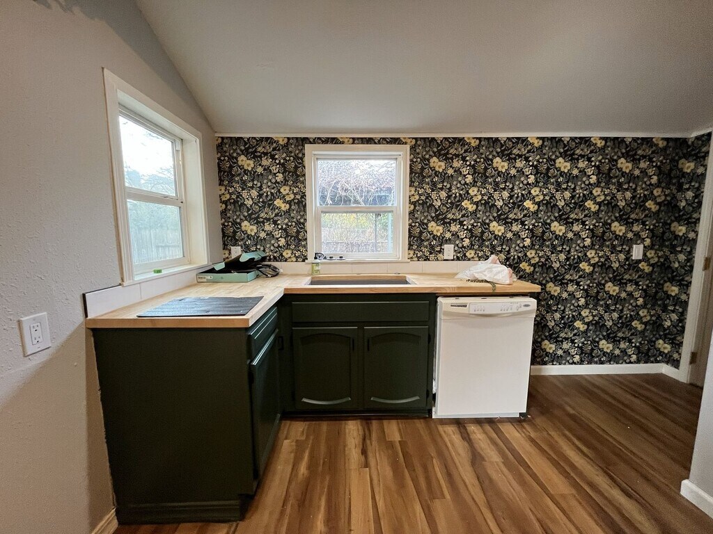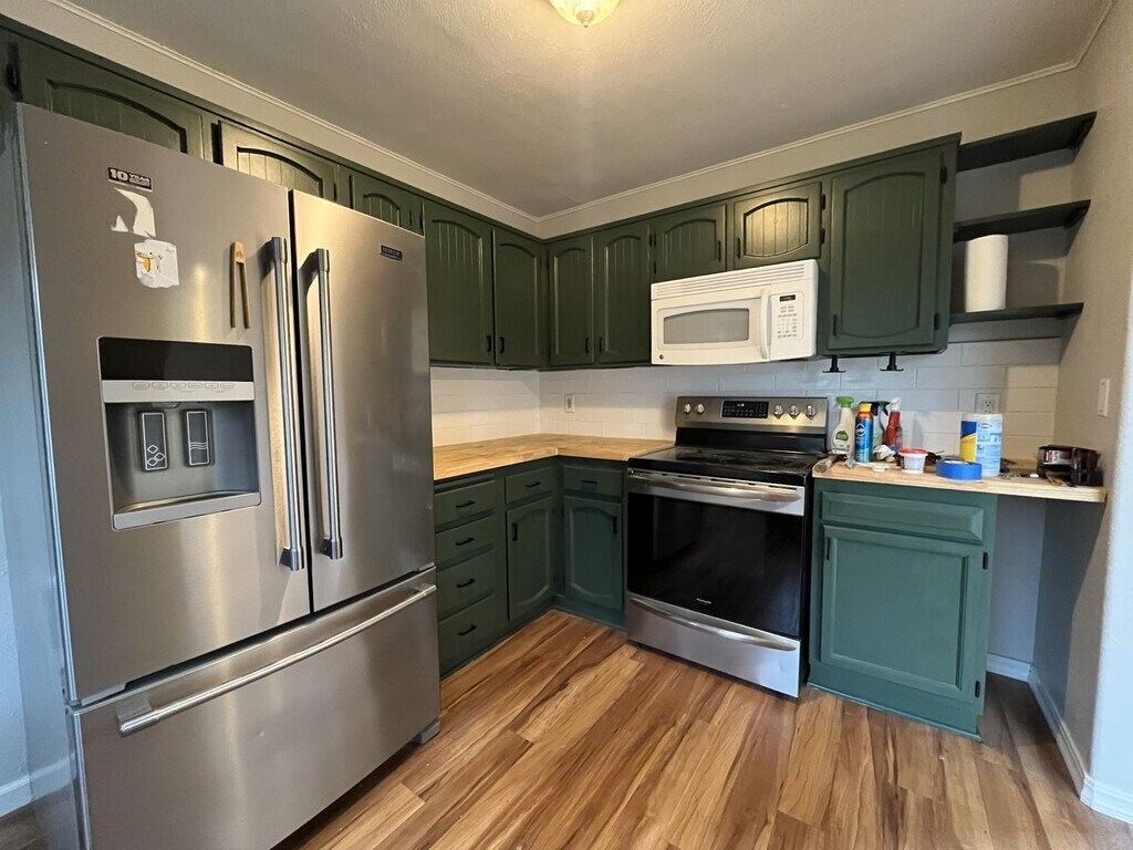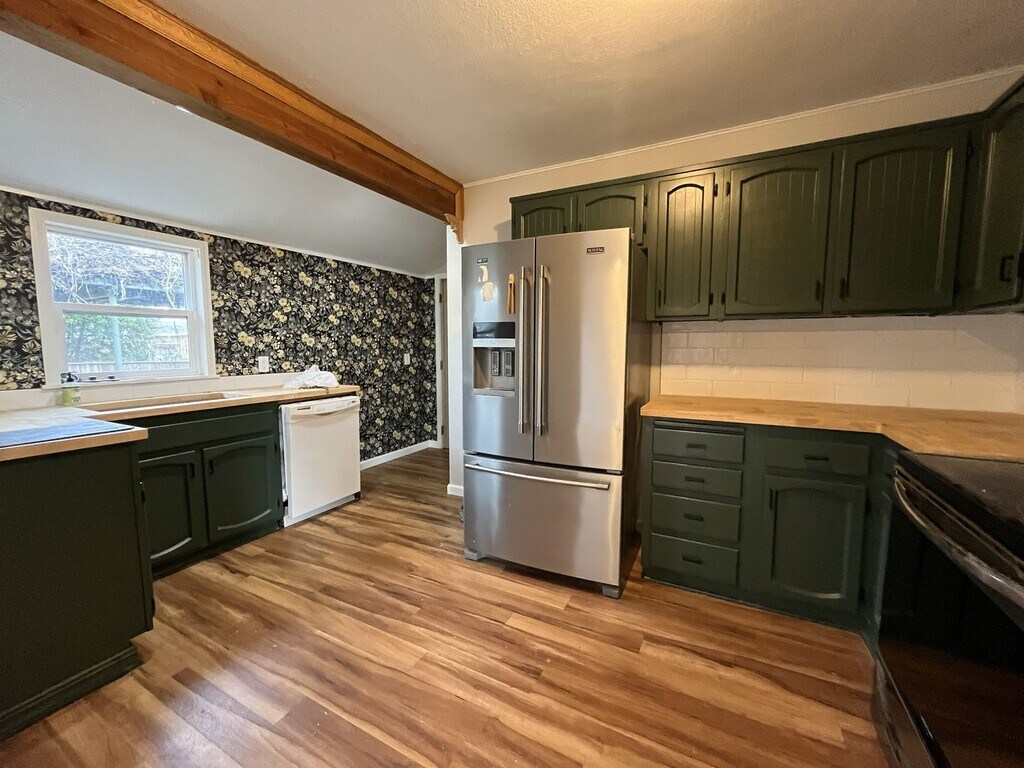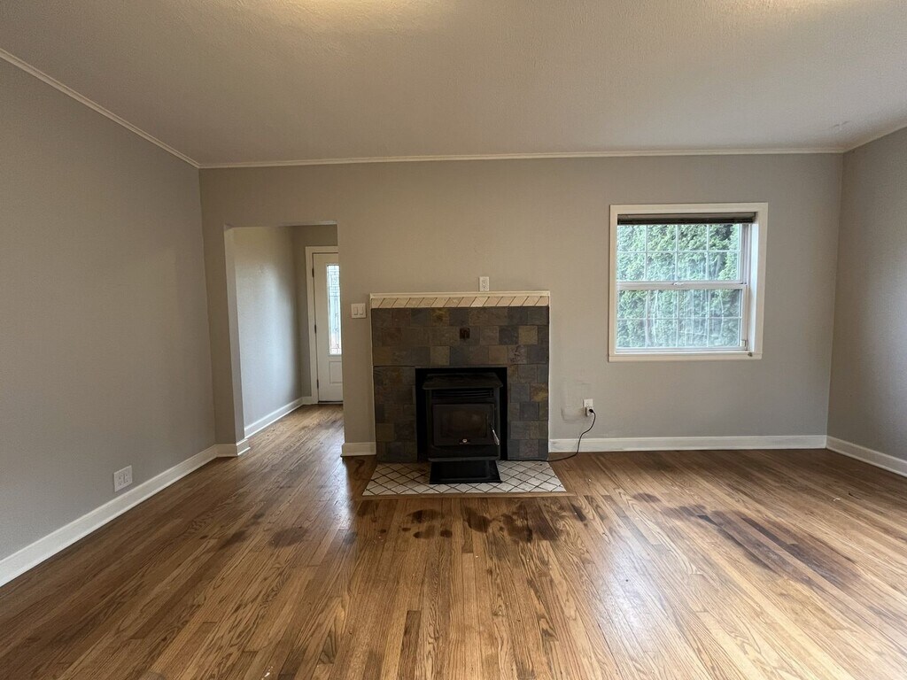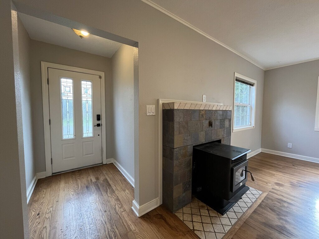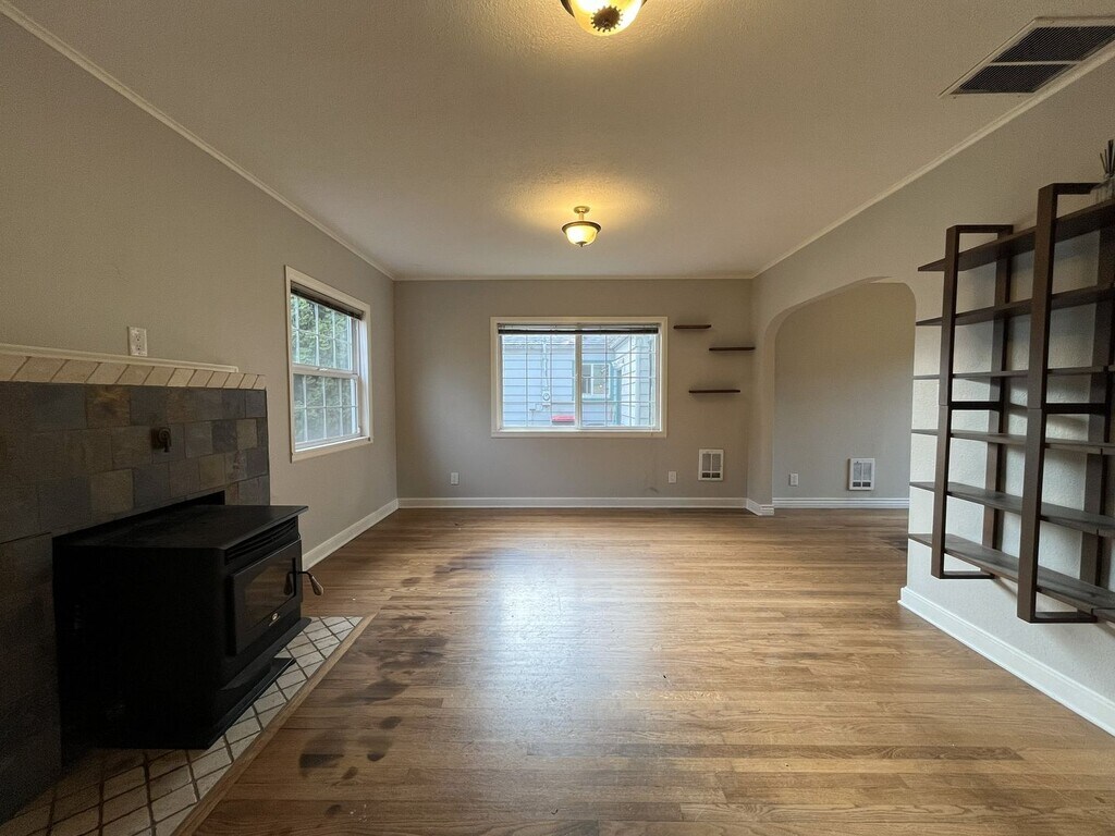This charming single-level two bedroom, one bathroom home offers 1,282 square feet of comfortable living and thoughtful updates. The exterior features a spacious front lawn divided by a central walkway and framed by a privacy hedge. A raised wooden front deck creates an inviting setting for morning coffee or quiet outdoor lounging. Stepping through the entry, you are welcomed into the bright living room. This space features hardwood flooring throughout, a built-in fireplace, built in shelving, and windows along two walls that fill the room with natural light. Adjacent to the living area is a dedicated dining room with a sliding glass door leading to the exterior and a contemporary light fixture overhead. The kitchen is roomy and well-equipped, featuring an oversized French-door refrigerator with pull-out freezer, electric glass-top stove and oven with a mounted microwave above, and a dishwasher paired with a stainless steel sink. Green cabinetry adds a pop of modern character, complemented by generous wood countertops and abundant storage and prep space. The bedroom spaces are positioned down the hall. The first bedroom offers hardwood flooring, windows on two walls, a sliding door closet, ceiling fan, and wood slat accent wall for added visual interest. The second bedroom also includes hardwood flooring, a ceiling fan, a wood slat accent wall, and a walk-in closet. Between the two bedrooms sits a full bathroom with a single vanity, linen storage, and a tub/shower combination. A laundry room located just past the kitchen offers full-size washer and dryer accommodations and additional utility space. Call or Text Our Leasing Agent to schedule a showing! English Speaking Spanish Speaking YouTube Link: Visit our website to apply and view other homes we have available! Do you need property management services? Maximize your income and cut your costs!