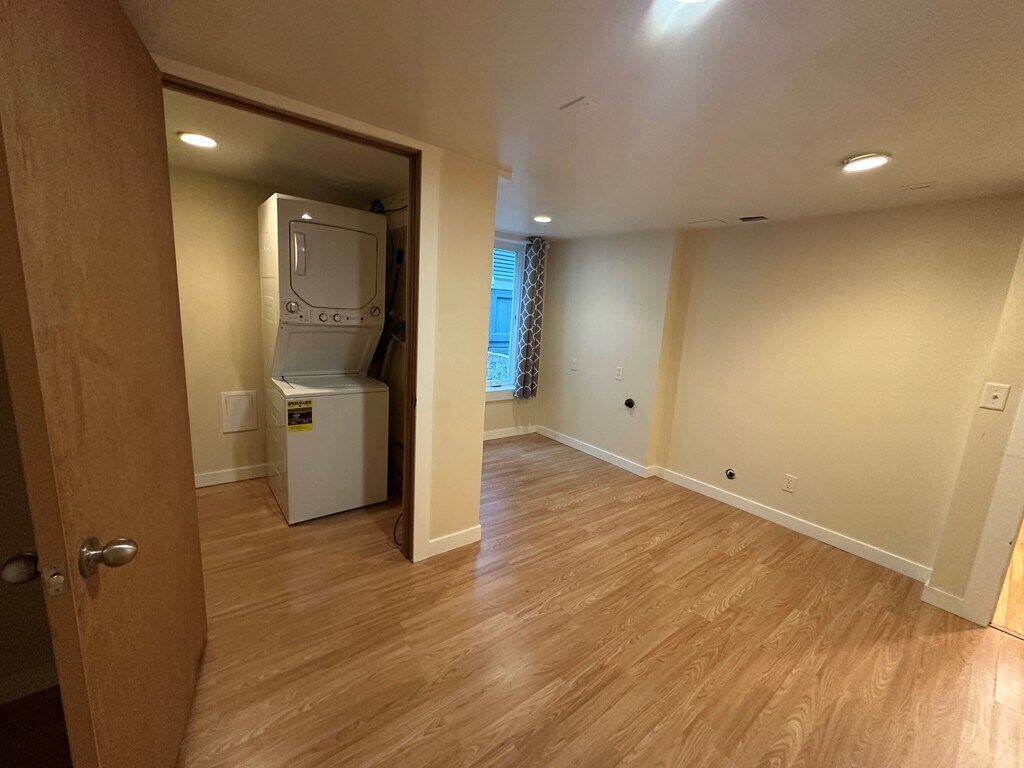 Now is your opportunity to rent this lower-level floor of this fabulous North Cap Hill home! Enter from beautifully landscaped backyard with area for gardening. Open Kitchen/Living area that opens to flex space with pocket doors perfect for extra living space, den/office or bedroom. Primary bedroom is on the other side with full suite, bath and walk-in closet. Door from this bedroom goes to patio with access to hot tub! Third bedroom is down the hall, where there is a utility room with stack washer/dryer. Shared use of grounds with tenant upstairs. Parking in alley and street with no permit required. Fenced backyard. All applicants 18+ please apply at ; $45 per applicant. Utilities shared @ 50% with tenants upstairs. Pets case by case with extra deposit.