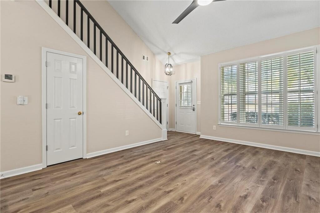 Tucked in a quiet Alpharetta community,this home has a simple sense of comfort that shows up the moment you walk in. The main level feels open yet grounded. Enter a two-story living room with warm natural light,a gas fireplace framed by built-ins,and a layout that connects seamlessly to the kitchen and out to the back patio. The wooded lot behind it makes mornings quieter and evenings calmer,a little pocket of privacy right where you want it. The primary suite on the main floor adds effortless flow to daily life,while upstairs you’ll find two spacious bedrooms and a full bath that works well for guests,family,or a flexible home office setup. Freshly painted with new LVP flooring,updated light fixtures,and ceiling fans throughout,the home feels crisp and cared for. You’ll find thoughtful storage at every turn! Home provides two kitchen pantries,several large closets,and a garage with space for another car in the driveway without blocking anyone in. Close to GA-400,Avalon,the Greenway,and all the conveniences of North Fulton. This is one of those homes that’s just easy to live in.