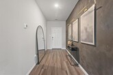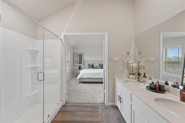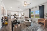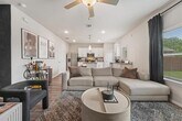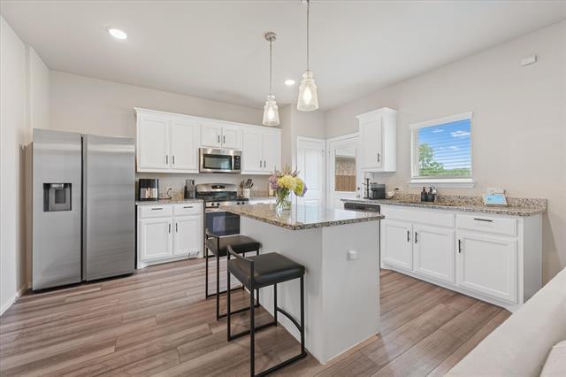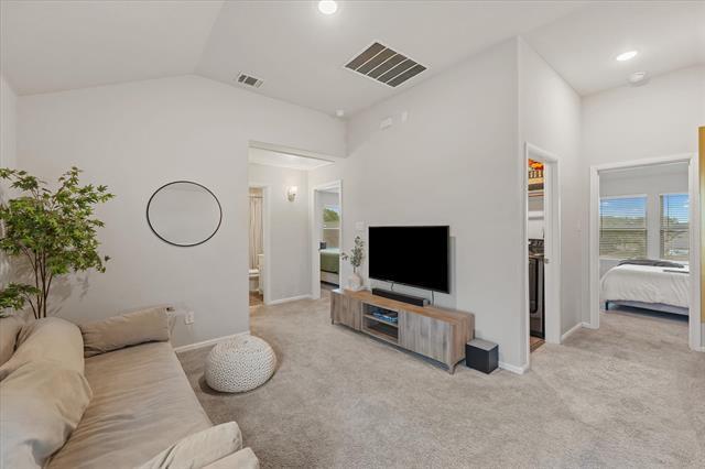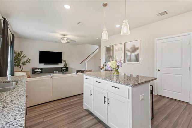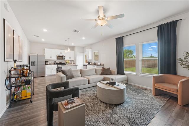 Experience this stunning 3-bedroom, 3-bath home offering 1,600 square feet of thoughtfully designed living space, ideally located just 20 minutes from Downtown Dallas. This elegant residence features an open-concept layout perfect for entertaining and everyday living. The kitchen showcases light oak luxury vinyl flooring, 36-inch white cabinetry with modern hardware, pendant lighting over the island, and ample workspace for any home chef. The living area is filled with natural light from numerous windows, creating a bright and inviting ambiance, while striking black accent walls in the foyer add a stylish, contemporary touch. Upstairs, enjoy a spacious media room ideal for movie nights or entertaining guests. The primary suite offers a relaxing retreat with a large walk-in shower and a generously sized walk-in closet. Step outside to a large backyard, perfect for hosting gatherings, grilling, and enjoying the outdoors. Conveniently located near shopping centers, biking trails, and with quick access to I-30 and Lyndon B. Johnson Freeway, this home combines comfort, style, and accessibility. Schedule your showing today!