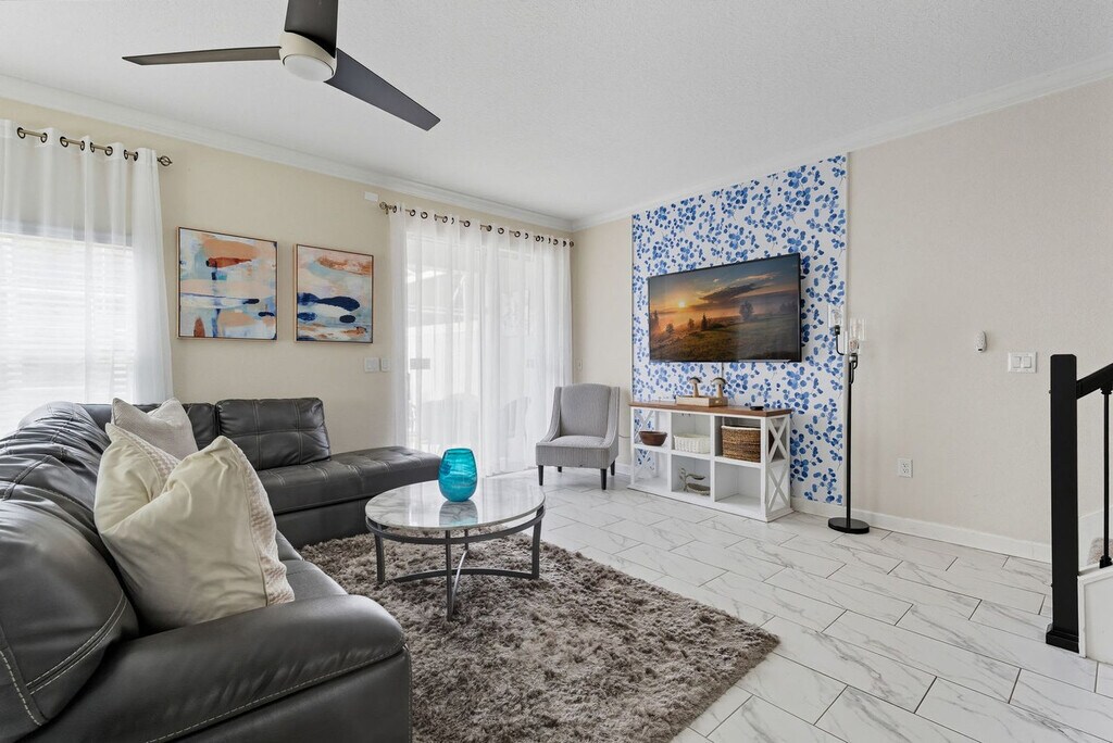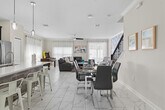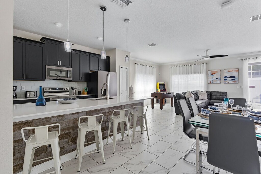 Feel at home in this 5-bedroom, 4-bath townhome at Champions Gate Resort, accommodating up to 12 guests. This spacious townhome is thoughtfully designed for comfort and family fun. The open living area blends seamlessly with the dining space and fully equipped kitchen, making it ideal for relaxing meals and quality time together. Kids will love the games in the living room, while everyone can enjoy stepping outside to the private, heatable pool. The home also offers a laundry room with washer and dryer, complimentary Wi-Fi, and a welcome kit with starter bathroom and kitchen essentials. Pool heating is available as a paid service, and barbecue use carries an additional fee. Champions Gate Resort offers every imaginable amenity for a blissful stay, including an impressive clubhouse with a variety of courts and outdoor activities like tennis, beach volleyball, and a golf course, while its restaurant and fitness center will help you stay refreshed and fit. Its swimming pool complex is perfect for a splashy day, with slides, a lazy river, and a kids splash pool. Plus, the resort is just 20 minutes away from Disney Parks. Shopping, dining, and entertainment are also within reach, with stores, restaurants, and supermarkets nearby. Quiet hours are between 10 PM and 8 AM. No smoking and no pets are allowed. [SI]