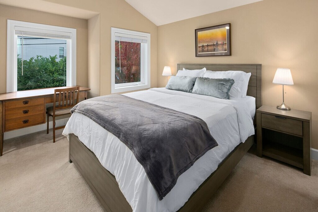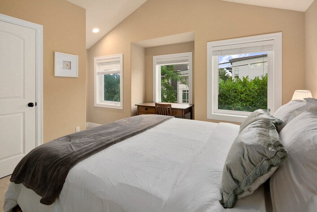 Feel at home in this cozy three-story townhome, perfect for groups and families, located in a vibrant neighborhood with easy access to groceries, cafes, and restaurants. This spacious 1,400 sqft home features three bedrooms, each with its own attached bathroom, ensuring comfort and privacy. The townhome offers a seamless entry with no steps and is conveniently situated near bus routes for a quick transit to downtown. Enjoy a warm and bright living space with a fully stocked kitchen, complete with appliances, cookware, silverware, servingware, spices, and a Keurig coffee and tea maker. The first floor hosts a bedroom with a full-size bed and an ensuite bathroom, while the second floor features a living room with two sofas, one of which is a full-size pull-out bed, a dining area, and a half bath. The third floor includes two bedrooms with queen beds, both with ensuite bathrooms, and a laundry area. Central air conditioning is available throughout the home. The townhome offers a dedicated parking spot and ample street parking. The garage is not part of the rental and cannot be used for parking, but there is a private driveway suitable for tandem parking for two small cars or one large car. Welcome to the Central District of Seattle, a historically significant and culturally rich neighborhood known for its diverse population and vibrant community. Enjoy an eclectic mix of independently owned cafes, restaurants, shops, and vibrant cultural events and street art. With a high walk score, it's easy to explore the area on foot, and bus stops are just a five-minute walk away. Ride-share services are highly recommended for convenient travel, and dedicated parking is available if you're bringing a car. The townhome is located at the intersection of two main roads, which may result in some road noise when bedroom windows are open. Earplugs are provided for a better sleep experience. This property is not handicap friendly and requires comfort with stairs due to its multiple stories. The regular nightly rate covers six guests, with additional guest fees of $25 per person per night, up to a maximum of eight guests. This is a no-pet home with a $500 fine for unauthorized pets. Strictly no parties or events, and quiet hours are enforced between 10pm and 8am. No smoking or vaping is allowed on the property, and a $500 fine applies per violation. Check-in and check-out times are flexible to accommodate your schedule. A laptop computer is not included in the home office set-up. Registration Number: STR-OPLI-21-000729 [SI]