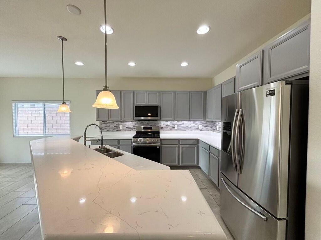 This elegant single-story 4-bedroom, 2-bath residence offers the ease and sophistication of one-level living with a seamless, open flow. Fresh interior and exterior paint enhance the home’s bright, polished ambiance. The primary and secondary bedrooms are comfortably carpeted, creating quiet and inviting retreats. A fully finished backyard featuring artificial turf and thoughtfully designed, low-maintenance landscaping provides a private setting ideal for outdoor lounging or entertaining. Solar panels help maintain consistently low energy costs. Referral Agent Commission: $400. Contact the listing OFFICE for any questions. Rent AS-IS. All applicants over the age of 18 must apply with front/back ID, last 2 months pay stubs & bank statements, and $65 NON-Refundable application fee. $650 pet deposit per pet (small pets), $60 key deposit, $450 clean deposit, $300 utility deposit. Requirement: minimum 600 credit score for all applicant and monthly household net income 3x the rent. To apply, please visit