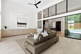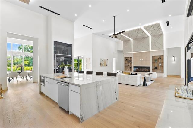 Contemporary, one-of-a-kind architecture meets sophisticated luxury in the prestigious Hillcrest Estates. This stunning custom home is designed for exceptional living, with every feature carefully selected for beauty, functionality, and effortless entertaining. Defined by sleek lines, expansive windows, dramatic sliding doors, soaring ceilings with LED accents, and an elegant mix of premium finishes, the residence exudes modern elegance. The open floor plan is drenched in natural light, framing captivating views of the resort-style pool and impeccably landscaped grounds. The gourmet kitchen is a showpiece, offering a generous eat-around center island, impressive ceiling design with integrated lighting, a 48-inch Monogram gas range, built-in 48-inch Monogram refrigerator, Monogram microwave, dishwasher, and dual wine coolers. Flowing seamlessly from the kitchen, the great room features a contemporary fireplace, custom built-in bookcase, decorative wall elements, and oversized multi-slide glass doors that lead to the sunroom and poolside retreat. The great room and primary suite both open to a private backyard oasis with low-maintenance artificial turf, a covered lounge area, and a sparkling pool—perfect for year-round outdoor enjoyment. The luxurious primary suite offers tranquil views of the pool and spa. Its spa-inspired bath includes dual vanities, a freestanding soaking tub, a separate steam shower, a three-person sauna, and a custom-designed walk-in closet. Additional amenities include a versatile office, a game room or second dining area with a decorative dry bar area, four bedrooms, and five full baths, making this residence as functional as it is breathtaking.