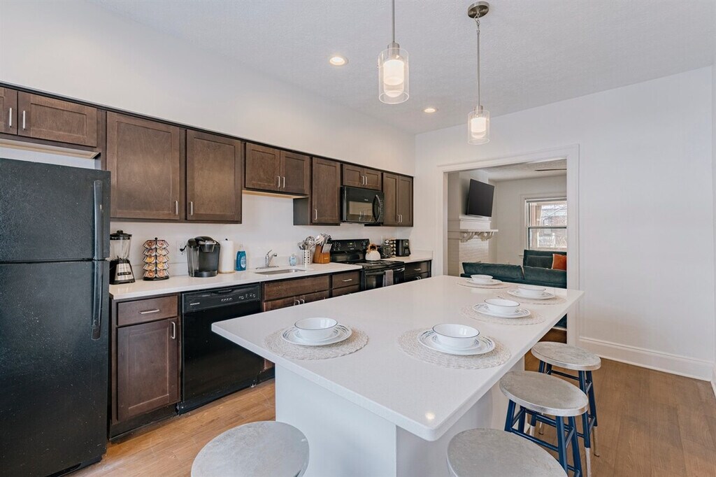 Feel at home in this modern 5-bedroom townhome, just steps from University Circle, Cleveland Clinic, Case Western, museums, and Little Italy. This spacious townhome features two living rooms, a fully equipped kitchen, and a cozy basement lounge with foosball. Modern décor, comfortable bedding, and open living spaces make it ideal for large groups and families. It comfortably sleeps up to 10 guests and offers fast Wi-Fi and smart TVs. Pets are welcome with a fee of $150 plus taxes and fees per pet, up to a maximum of one pet. Located in one of Cleveland’s most walkable cultural districts. A renters agreement will be sent via email to sign. [SI]