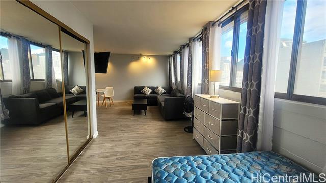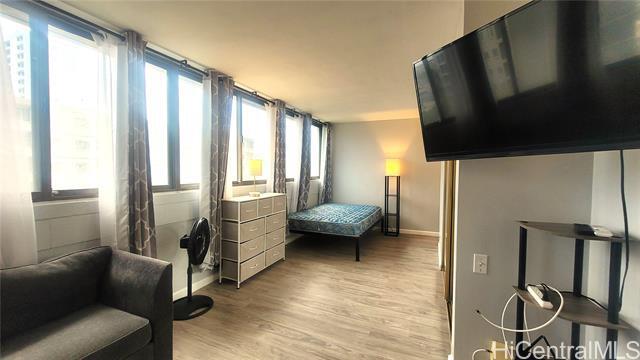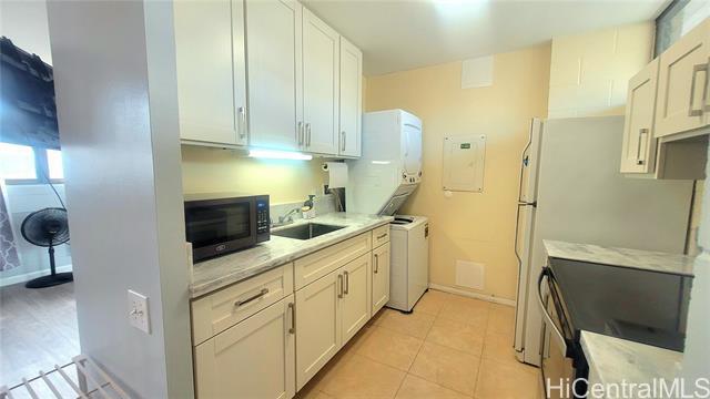 Furnished as shown in listing (can be rented unfurnished as well) - 1 bedroom unit converted to a spacious studio with lots of windows and 2 closets. Quartz countertops in kitchen and bathroom.  Includes a washer/dryer and a window air conditioner.  1 assigned/covered parking stall within a secured gated garage.  Convenient to University of Hawaii, groceries, and freeway access. Pool on property. Tenant pays for electricity, internet/cable. Good credit, verifiable income, and renters insurance required.