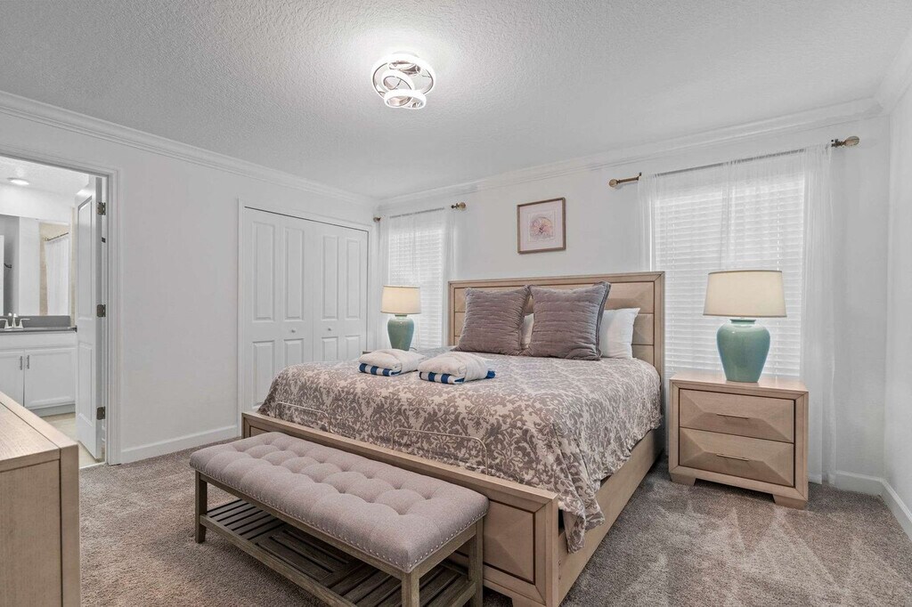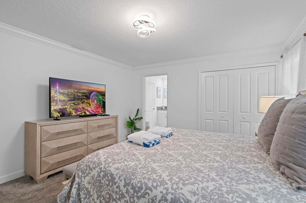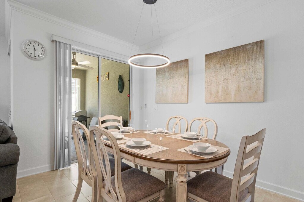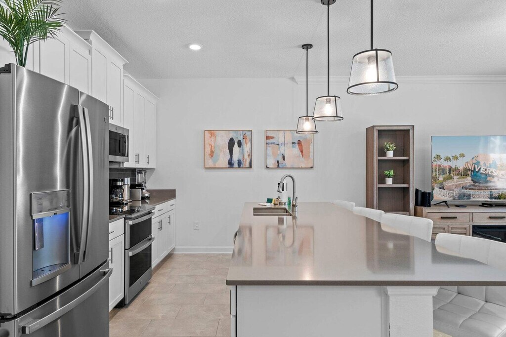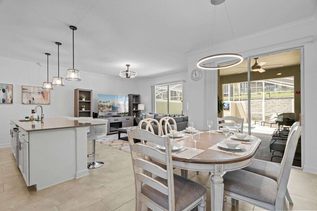 Enjoy a fun-filled stay in this 4-bedroom, 3-bath townhome for up to 10 guests. Features include Mickey and Princess-themed rooms, a private pool, and full access to Champions Gate Resort’s pools, lazy river, tennis courts, and mini-golf. Close to shops, restaurants, and markets, this Kissimmee home is the perfect mix of comfort and adventure for your family vacation. Welcome to your perfect home-away-from-home! This beautifully decorated 4-bedroom, 3-bathroom townhome is thoughtfully designed for comfort, style, and unforgettable family memories. The open-concept living, dining, and fully equipped kitchen areas create a cozy and social space ideal for relaxing and sharing meals together. Step outside to enjoy your private, heatable pool on the patio—a peaceful spot to unwind after a day of fun. The first floor features a charming queen bedroom with a breezy beach theme and a full bathroom just steps away. Upstairs, you’ll find the elegant king master suite, a lovely princess-themed room with a queen bed and a single extra bed and a playful Mickey Mouse room with a bunk bed (double and twin)—perfect for kids or the young at heart. The home also offers a laundry room with washer and dryer, free Wi-Fi, complimentary parking, and a welcome kit with essential kitchen and bathroom items to start your stay with ease. Get ready to make magical memories in this cozy and inviting retreat—where comfort meets charm in the heart of your dream vacation! Guests are responsible for restocking kitchen and bathroom supplies during their stay. Pool heating and use of the barbecue grill are available for an additional fee. Champions Gate Resort is a resort-style community that offers every imaginable amenity for a blissful stay. It features an impressive clubhouse with a variety of courts and outdoor activities like tennis, beach volleyball, and a golf course, while its restaurant and fitness center will help you stay refreshed and fit. Its swimming pool complex is perfect for a splashy day, with slides, a lazy river, and a kids splash pool. Plus, the resort is just 20 minutes away from Disney Parks, ensuring plenty of opportunities for fun and adventure. Shopping, dining, and entertainment are also within reach, with stores, restaurants, and supermarkets nearby. It's the perfect place for a family getaway; come and experience all the perks of Champions Gate Resort! Quiet hours are between 22:00 and 8:00.