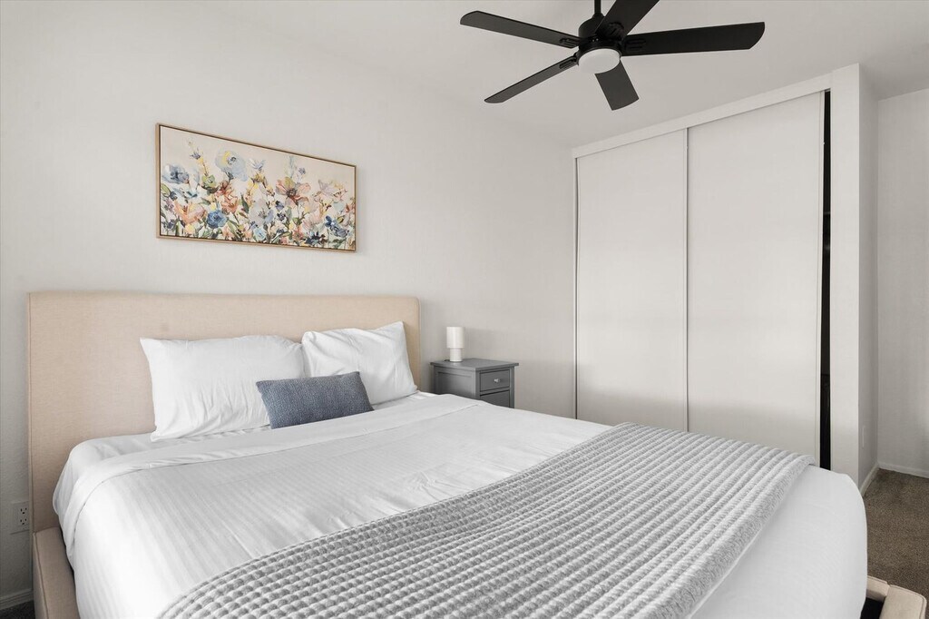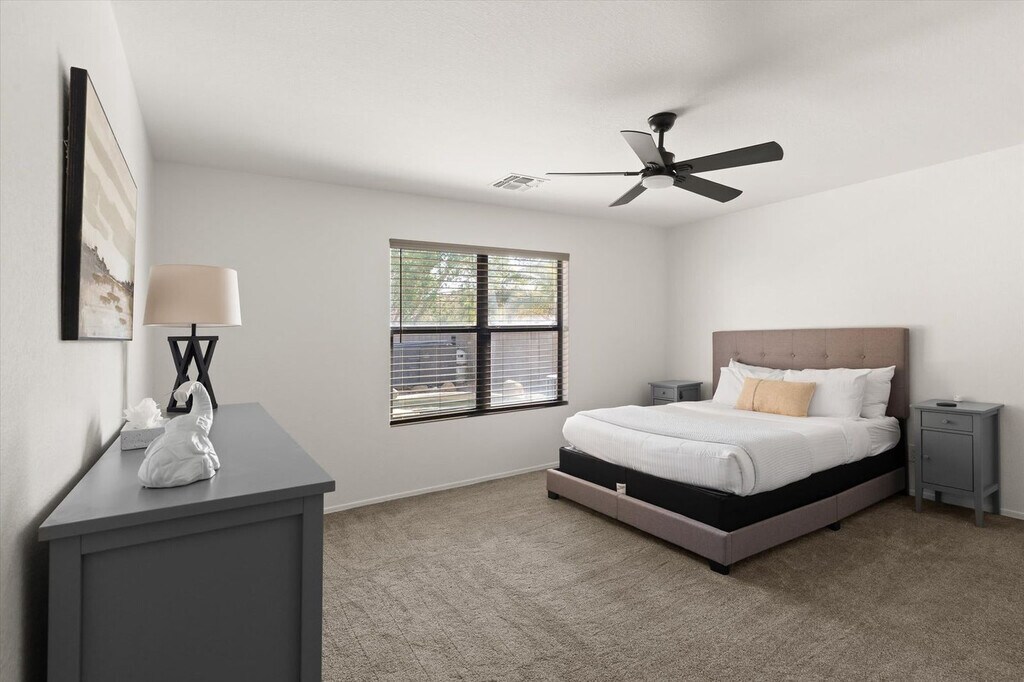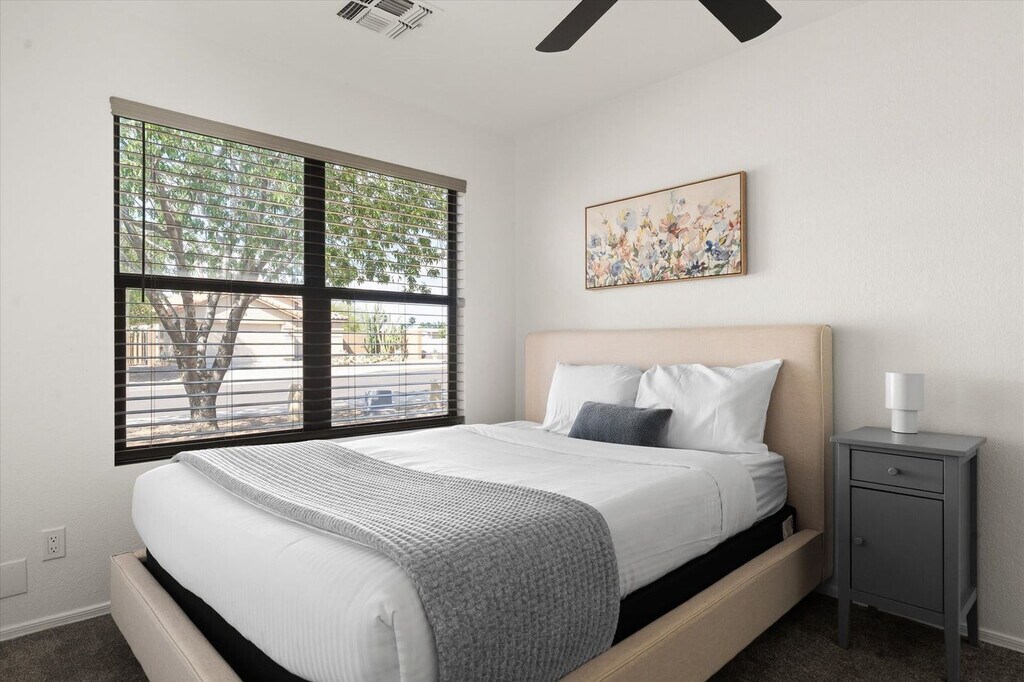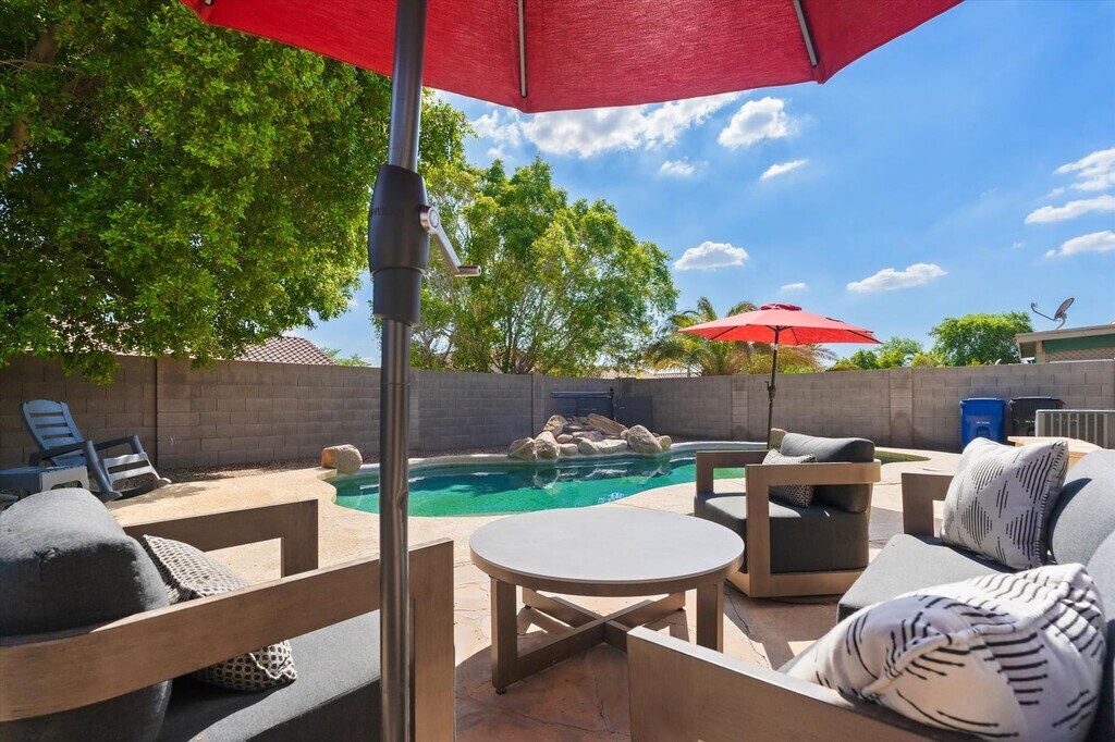 Welcome to your Arizona desert escape! This charming Mesa retreat features 3 bedrooms and 2 bathrooms, offering plenty of space to comfortably accommodate up to 6 guests. Whether you’re planning a family getaway, a friends’ trip, or need a sunny place to relax, this home is designed for comfort and convenience. Enjoy bright open living spaces, cozy bedrooms, and a warm desert vibe that makes every day feel like a vacation. With its ideal Mesa location, you’ll be just minutes from exciting attractions, delicious dining, and endless adventure under the Arizona sun! This 3-bedroom home is jam-packed with amenities and has everything you need for an amazing vacation in Mesa, AZ! Enjoy a private pool, fire pit, outdoor patio and dining area, BBQ grill, and card games. The fully stocked kitchen includes high-end appliances, a large refrigerator, ample cabinetry and cooking space, and a drip coffee maker. Relax in plush beds and enjoy the convenience of a washer and dryer, beach essentials, and a fully fenced yard. The living room features a 75” smart TV, a large plush sofa and seating, and a ceiling fan, all within an open floor plan. Parking is available in the driveway for a maximum of 2 cars. Nearby attractions include Goldfield Ghost Town, where you can step back into the Old West with mine tours and gunfight reenactments, just 13 miles away. The Mesa Arts Center, Arizona’s largest arts complex, is also 13 miles away, while the Mesa Historical Museum is 15 miles away. Enjoy live shows under the desert sky at the Mesa Amphitheatre, 13 miles away, or shop at the Superstition Springs Center, 8 miles away. Local dining favorites include Organ Stop Pizza, 9 miles away, and Crackers & Co. Café, 7 miles away. Renting a car or using rideshare services like Uber and Lyft are convenient options for exploring the area. Check-in is at 4pm and check-out is at 10am. No pets are allowed and no parties are permitted, with violations potentially resulting in immediate termination of the stay. An exterior camera is installed solely to monitor the cleaning team for quality and security purposes. Guests must be 25 years or older to book this property. A simple screening process is required within 48 hours of booking confirmation, and a rental agreement must be signed prior to check-in. A non-refundable $60 damage waiver is required, providing coverage for accidental damage during your stay, as long as it is reported prior to check-out. Wi-Fi is available throughout the home, providing a reliable connection for any remote work needs. [SI]