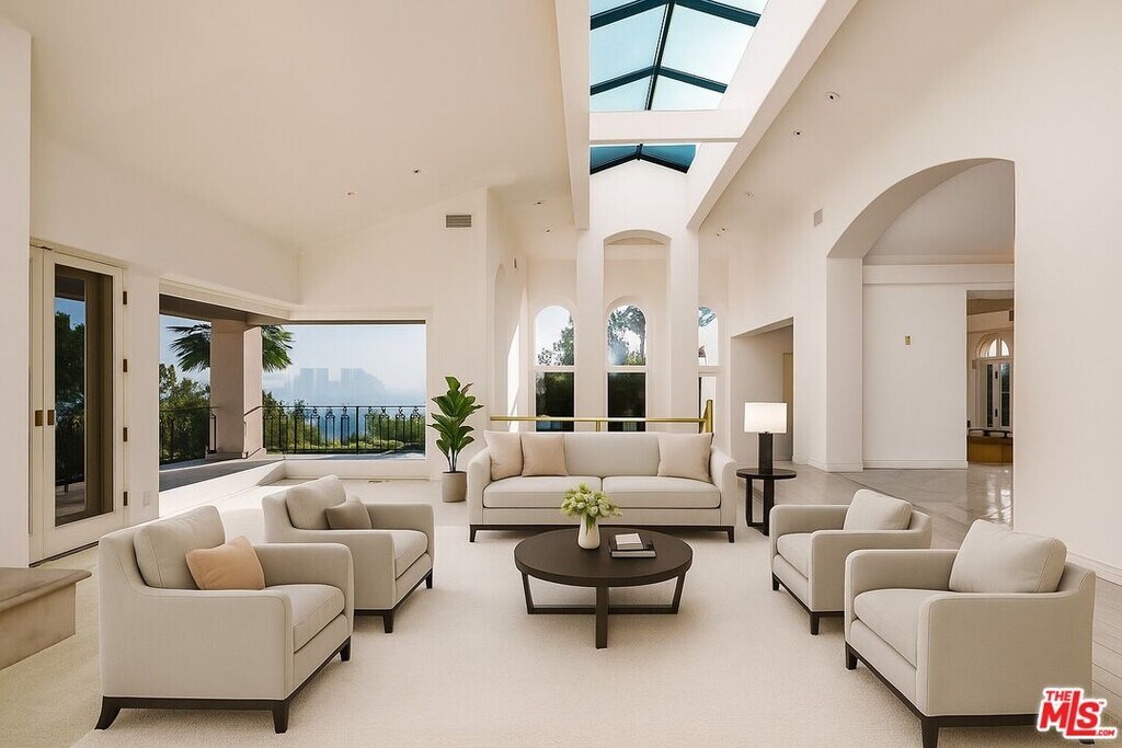 Commanding a premier position atop a coveted promontory on Billionaire's Row," this private nearly acre estate, designed by the esteemed architectural firm Benton, Park & Candreva, is a warm contemporary villa showcasing extraordinary panoramic views from Century City to the Pacific Ocean. A gated front courtyard leads to a grand entrance with soaring ceilings that opens to a luminous living room framed by walls of glass, seamlessly blending indoor elegance with outdoor splendor. The step-down media lounge, complete with a refined wet bar and curated art display, flows effortlessly into the formal dining room crowned by a radiant skylight. The primary suite serves as a serene retreat with a spa-inspired bath, dual walk-in closets, and direct access to tranquil outdoor terraces. The expansive dine-in kitchen balances form and function, while the lower level offers a mini kitchen, additional living areas, four guest suites, a temperature-controlled wine cellar, and ample storage. Outside, the resort-style pool, al fresco dining areas, and the signature "Summer Entrance" create a dramatic yet inviting atmosphere for grand-scale gatherings. Moments from The Beverly Hills Hotel and Rodeo Drive, this exceptional property presents a rare opportunity to reimagine and update a timeless architectural estate into a bespoke dream home, set against one of the most spectacular backdrops in Los Angeles." MLS# 25617263