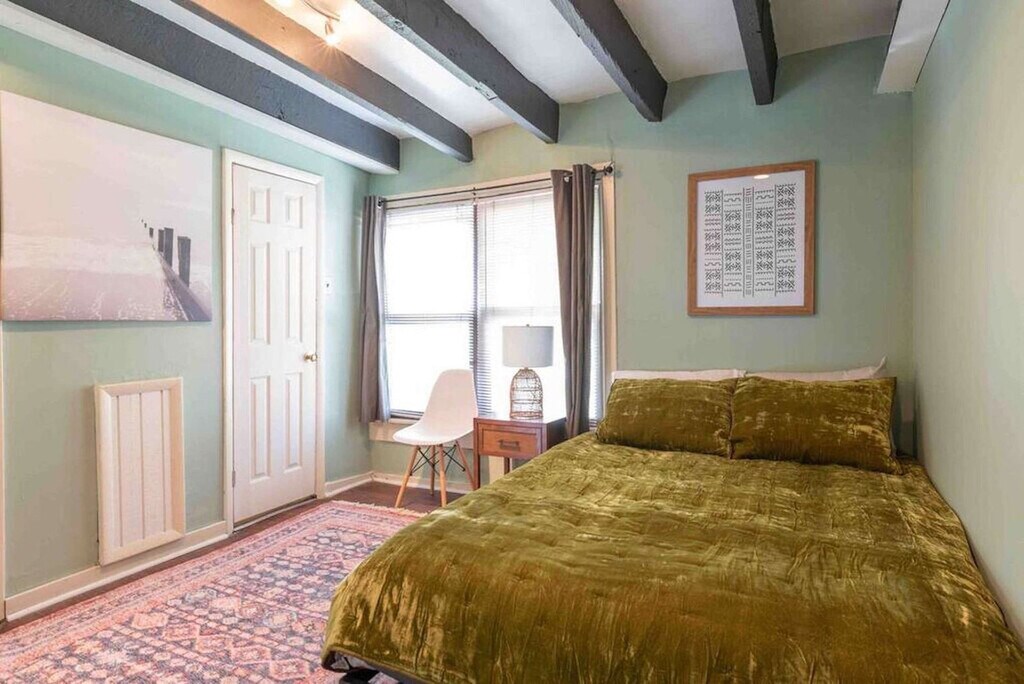 Located in the heart of the city, this charming 1918 Duplex offers a unique stay with its bi-level layout and cozy fireplace. Feel at home in this ideally located apartment, with Whole Foods, restaurants, a dog park, bars, and shopping all within walking distance. The apartment is conveniently close to a 24/7 garage parking just down the street. This Duplex apartment combines old charm with modern furnishings, featuring a cozy fireplace and a spacious outdoor deck with city views. The kitchen, illuminated by two skylights, is perfect for preparing breakfast. The space offers something for everyone, whether you prefer a hot coffee on the deck or a brisk walk through the park. For your convenience, there is a 24/7 parking garage just down the block, connected to the same building as the CVS on the corner. Situated at the heart of the city, this apartment provides easy access to various attractions, including University City, the Arts, Rittenhouse, Chinatown, Queen Village, Gayborhood, and the Old Town. With a 24/7 parking garage nearby, exploring the city is convenient and hassle-free. This apartment is located in a building with three flights of stairs leading to the bedrooms, with a handrail only on the side of the wall. It is not recommended for children or the elderly. Quiet hours are from 9 PM to 10 AM, and non-registered guests and visitors are strictly prohibited. Parties, gatherings, events, and filming are not allowed, with a $1,000 fine per incident and potential cancellation of your booking. Blocking the surveillance camera will also incur a $1,000 fine. Please wash your dishes before check-out, and dispose of food waste in the garbage, not the sink. Only toilet paper should be flushed down the toilet to avoid plumbing issues. A late check-out fee of $200 applies. Smoking is prohibited. This older apartment has unique characteristics, such as slower sink drainage and sloping ceilings, which add to its charm but may not suit everyone.
