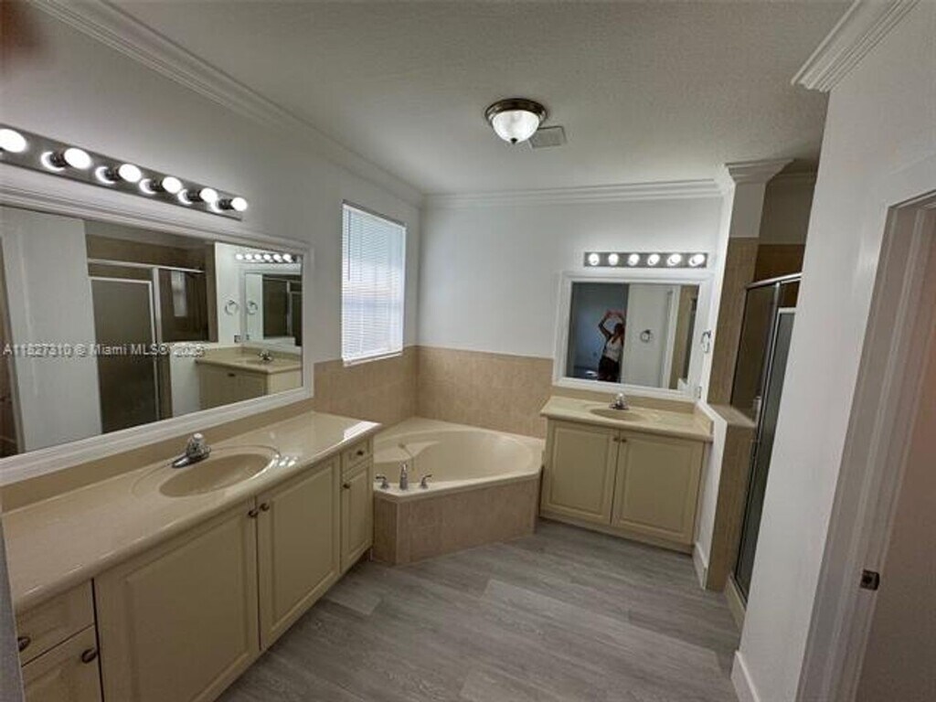 Courtesy of Nader International Realty This beautifully remodeled corner home is located in the safe and desirable Century Breeze West neighborhood, close to restaurants, shopping centers, hospitals, and more. Boasting 2,747 sq. ft. of living space, it features 4 bedrooms and 3 full bathrooms, including one bedroom and bath on the ground floor. Enjoy a large family room, wood floors throughout, brick-paver driveway, fenced patio, and parking for 2 cars plus a two-car garage with additional visitor spots. Residents have access to a clubhouse, pool, and basketball courts. The home includes basic cable and internet, and the front yard is maintained. Flexible lease options available, ready to move in—showings by 24-hour notice.