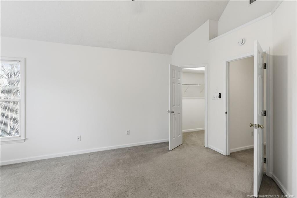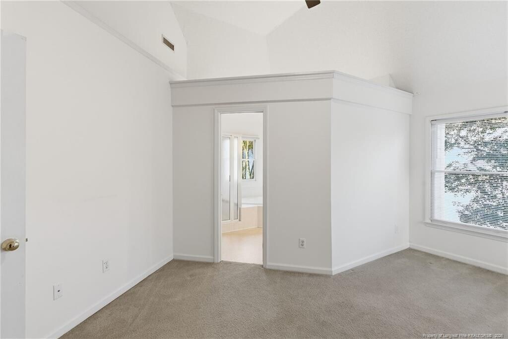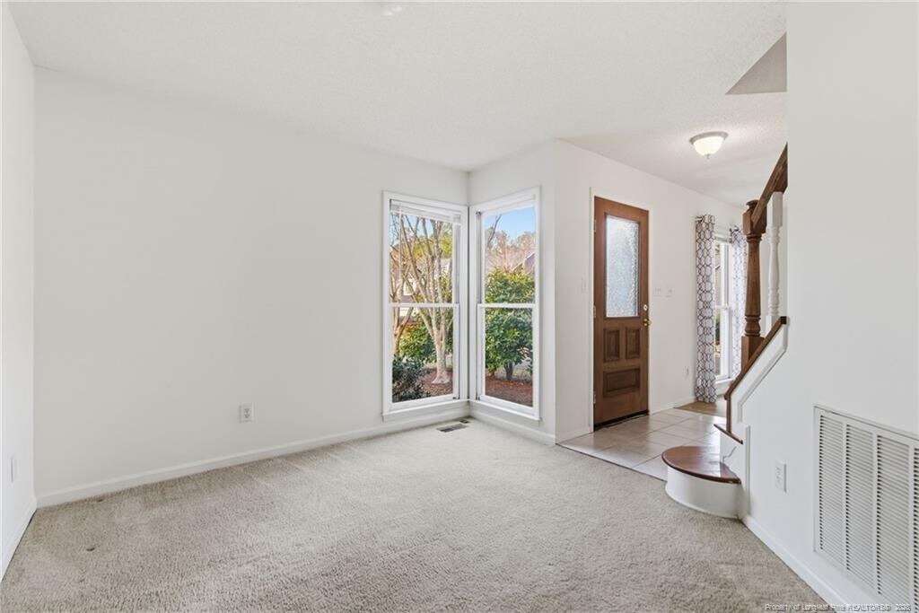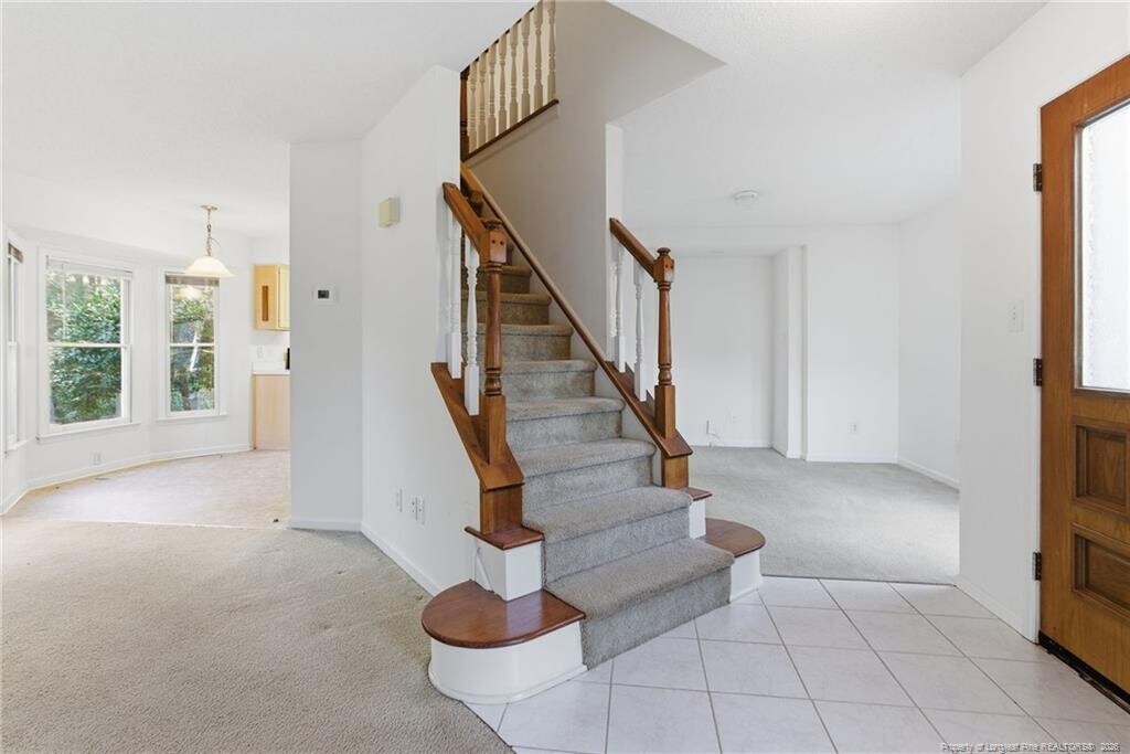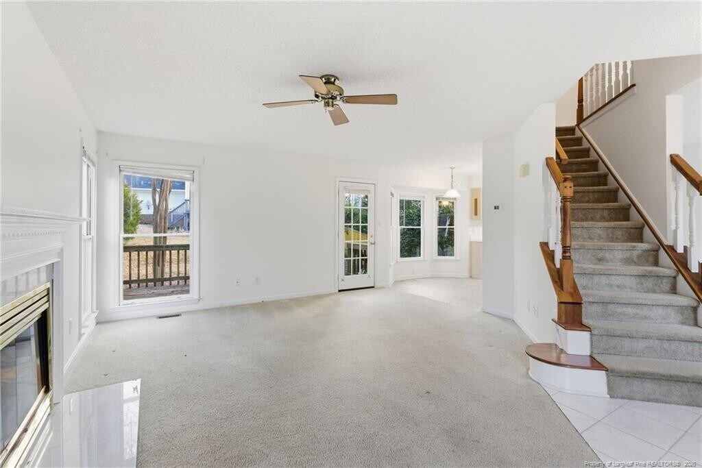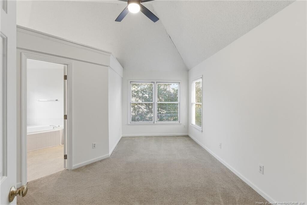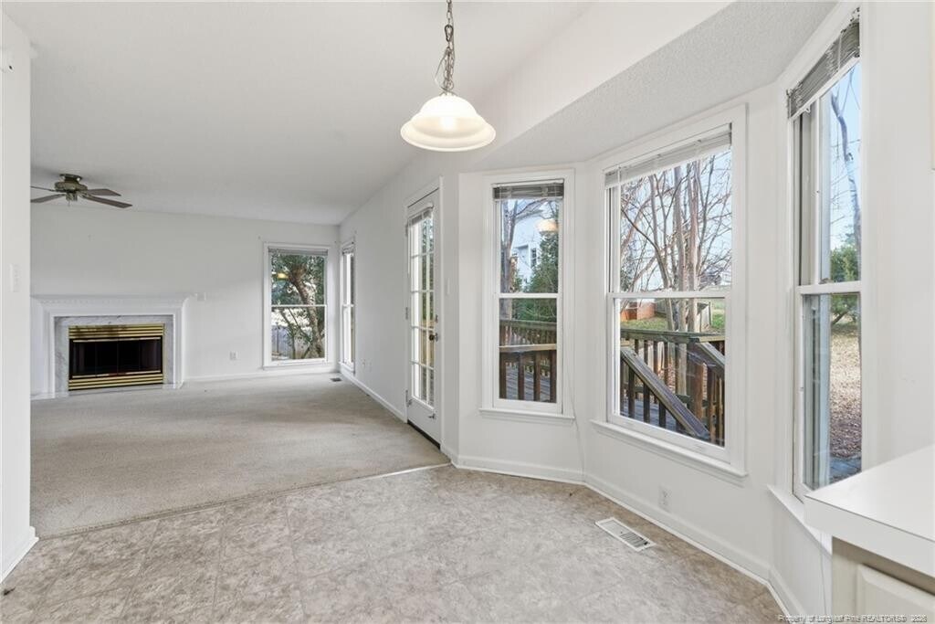 Available immediately, this beautifully maintained two-story home at 114 Covewood Court welcomes you with charming curb appeal, a classic front entry, and mature landscaping that enhances its peaceful cul-de-sac setting in the heart of Cary. Step inside to a light-filled entryway that leads into a spacious family room complete with a gas fireplace framed in marble, a ceiling fan, and generous windows that fill the room with natural light while providing a seamless connection to the kitchen and dining spaces. The bright, open kitchen features a large bay-window breakfast area overlooking the backyard, abundant cabinetry, expansive countertops, a center island, pantry, stainless steel appliances - including a gas range and French-door refrigerator and two picture windows above a double undermount sink. A formal dining room with sunlit windows offers a dedicated entertaining space or doubles as a home office, playroom, or flex area, and the first-floor powder room adds everyday convenience. Upstairs, the primary suite impresses with vaulted ceilings, a large walk-in closet, and an airy atmosphere that easily accommodates additional seating or workspace, all complemented by an en-suite bath with a garden tub, tiled shower, marble-topped double vanity sink with recessed soffit lighting just above, and a private water closet featuring a charming circular window. Bedrooms two and three are both equally spacious, each with double-door closets and picture windows. Bedroom 3 shares direct access to a well-appointed full hall bathroom with a marble topped double vanity and shower/tub combination. The one-car garage provides plentiful storage. Outside, the private backyard retreat offers mature trees, a generous deck, and a stone and gravel path creating a beautifully natural setting with minimal lawn maintenance, perfect for outdoor relaxation without the hassle of weekly yard work.