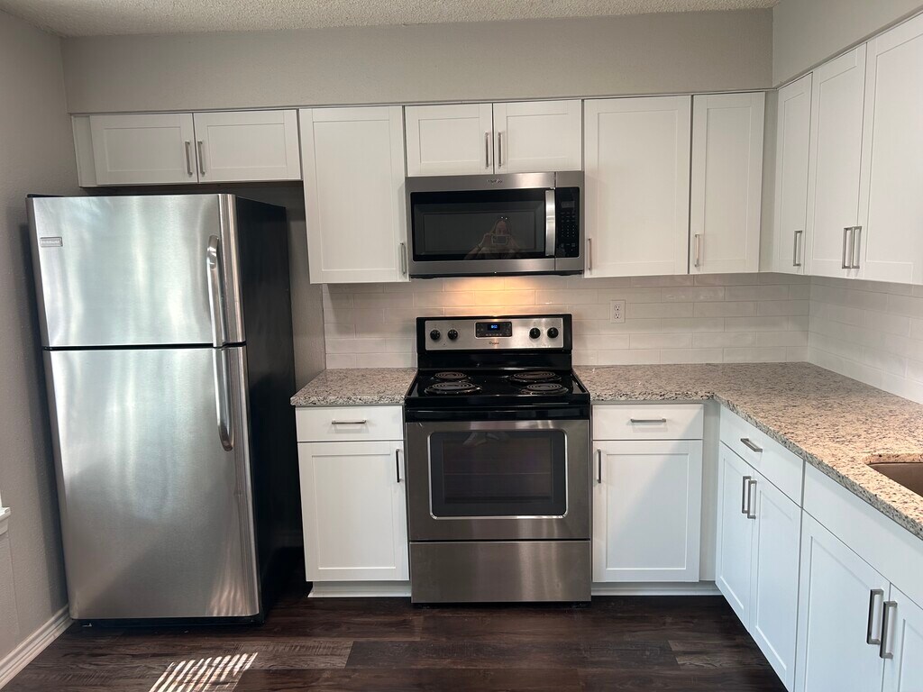 Newly remodeled kitchen to include new cabinets, counters, backsplash, sink/faucet, and microwave. Excellent location, close to highway access, shopping and bases. Quiet, established neighborhood. Walking distance to community park. Beautiful private backyard with towering oak trees and large covered patio. Lovely updated bathrooms. Primary suite separate. Utility room inside. Large two car garage. Sprinkler system for easier yard maintenance. Refrigerator included. Washer and dryer hook ups only. Home is NOT furnished. Staged for pictures. Dogs negotiable. No cats. Tenant pays for yard maintenance, all utilities. One year lease preferred, open to negotiating shorter lease terms. Long term lease available. Tenant is required to secure renter's insurance throughout the term of the lease.