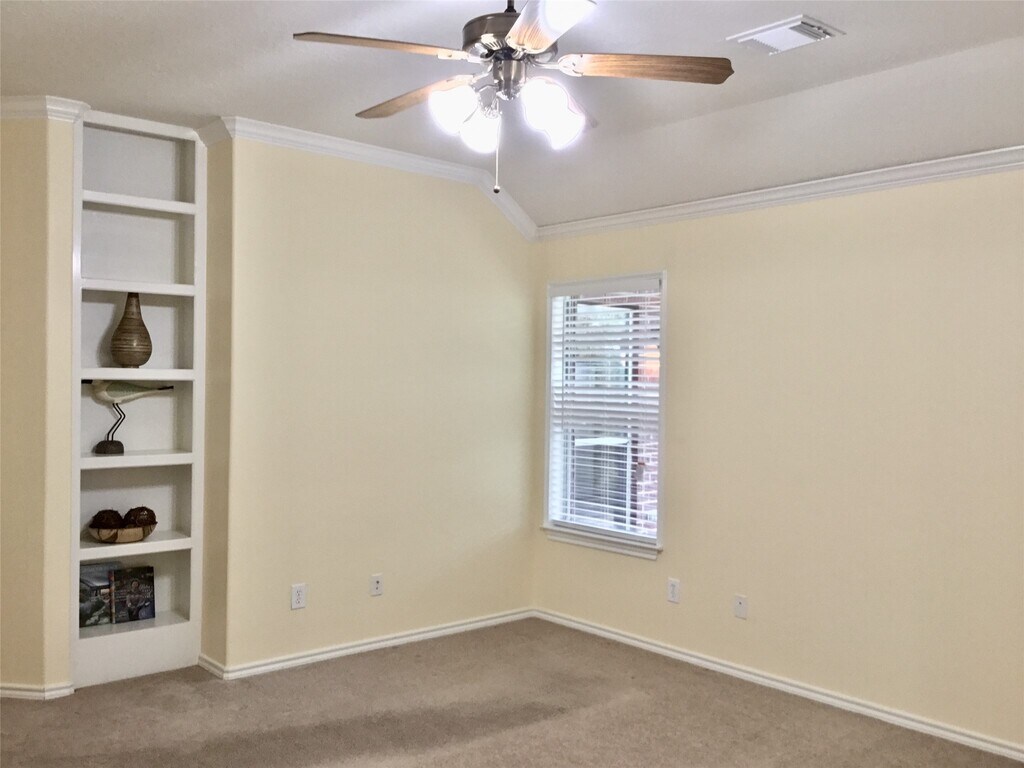 This impeccably maintained,all brick exterior,single story home in the Queenscliff neighborhood offers,fresh paint,carpet,high ceilings,crown molding,and laminate hardwoods in the den and formal dining room!! Built-ins accent the den and master suite. Tthe extra room attached to the master could be a nice sized study or nursery. Master suite offers 2 closets and builtins. The open spacious kitchen presents Avanza countertops accented with a tile backsplash and 42'' cabinets. Covered back patio,nicely landscaped yard,within walking distance to Coulson Tough and the pool/park on Cranbrook. Lovely neighborhood,beautifully cared for home,fantastic local landlord that is proactive and hands on. This beautiful home will delight your heart! Good credit and income are required. Availablel for immediate move in. MLS# 39509445