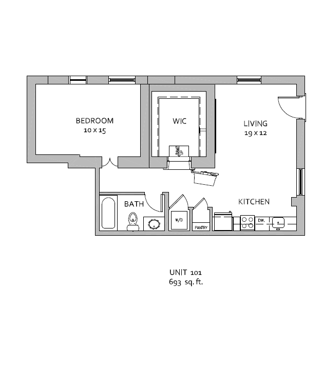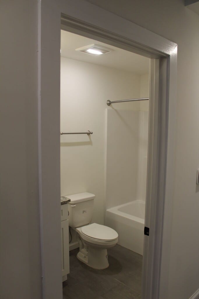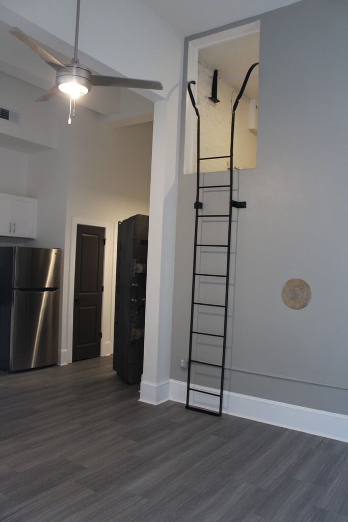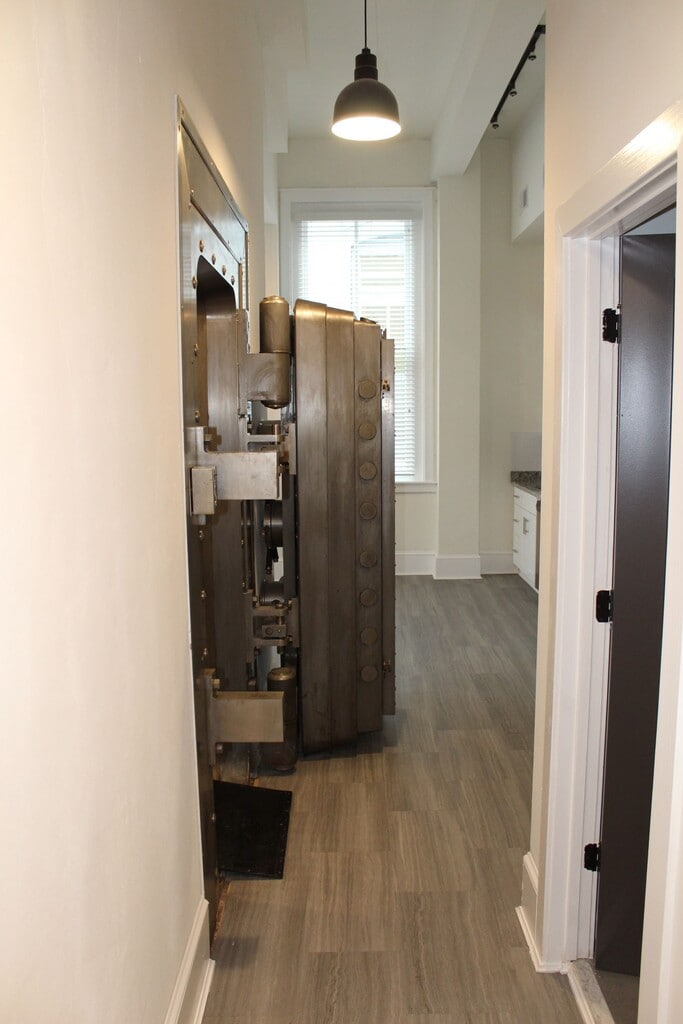 Woodstock Lofts is the mixed-use redevelopment of the historic School (403 W. Court Street) and Bank (114 W. Court Street) in charming Woodstock Virginia. This exciting redevelopment of the historic Bank (114 W. Court Street) building includes 5 upscale apartments, 2 commercial spaces for lease, as well as flexible storage options. Please note that there is no on-site parking at the historic Bank (114 W. Court Street) building for tenants nor their guests. For more information, please visit us at find us on Facebook, or just send us an email at . Tours are given by appointment only, please leave a message or send us an email if you desire a tour. Thanks for your interest in Woodstock Lofts. Unit 101 has it's own private entrance off the east/left-side alley. This unit also feature two bank vaults, the primary being tan extremely-secure closet (the vault door is non-functional!) and a minor vault repurposed as a bedroom.
