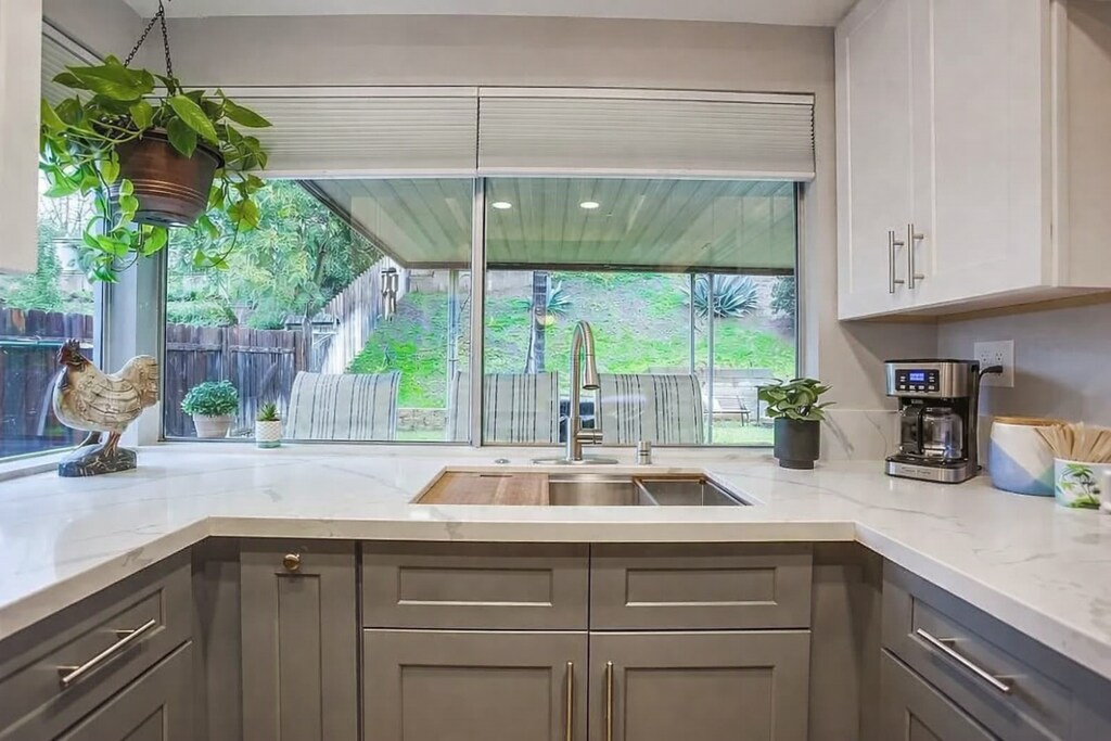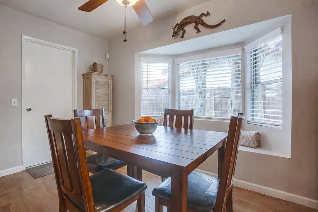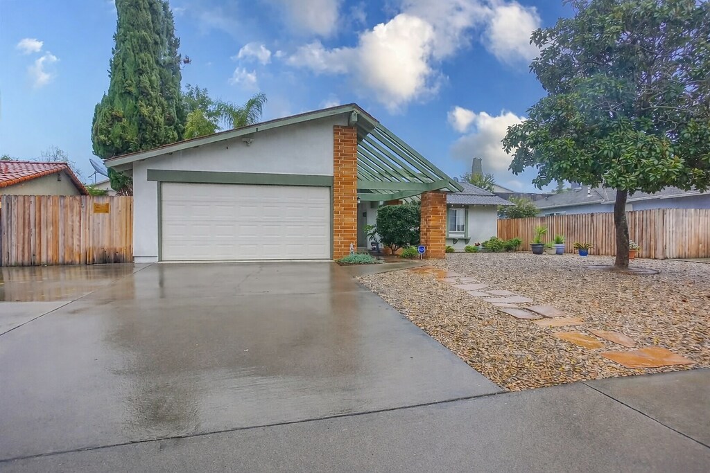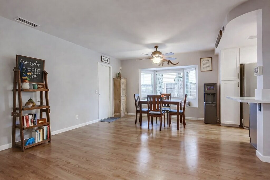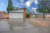 Stunning single-level home on a quiet, single-slotted street offering comfort, efficiency, and modern style. The remodeled kitchen features shaker-style cabinetry, quartz countertops, updated fixtures, and newer appliances—perfect for both everyday living and entertaining. Bathrooms have been tastefully updated with modern tub enclosures and fixtures. Laminate flooring flows throughout the home, complemented by fresh interior paint and a large skylight that fills the living room with natural light. Energy efficiency shines with an owned 21-panel solar system, central cooling, and a whole-house fan. Step outside to a private rear yard with a covered patio, convenient pass-through kitchen window, and plenty of space for outdoor dining and gatherings. A newer fence adds privacy, making this home a true retreat.