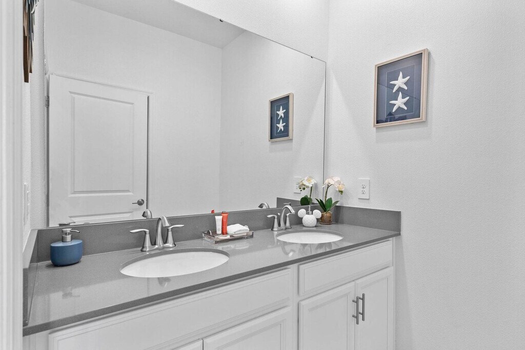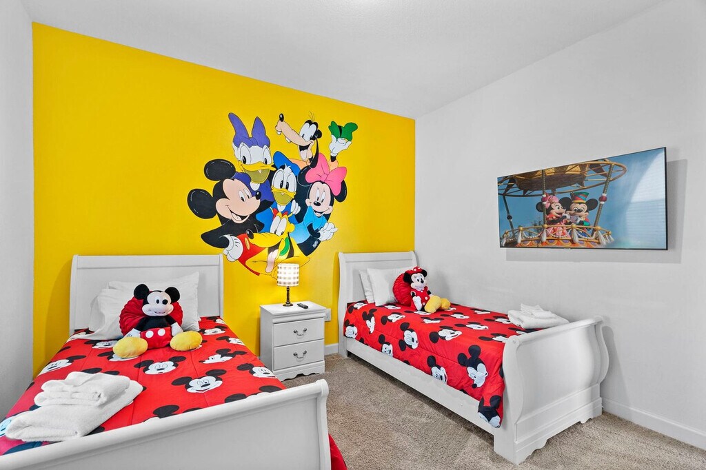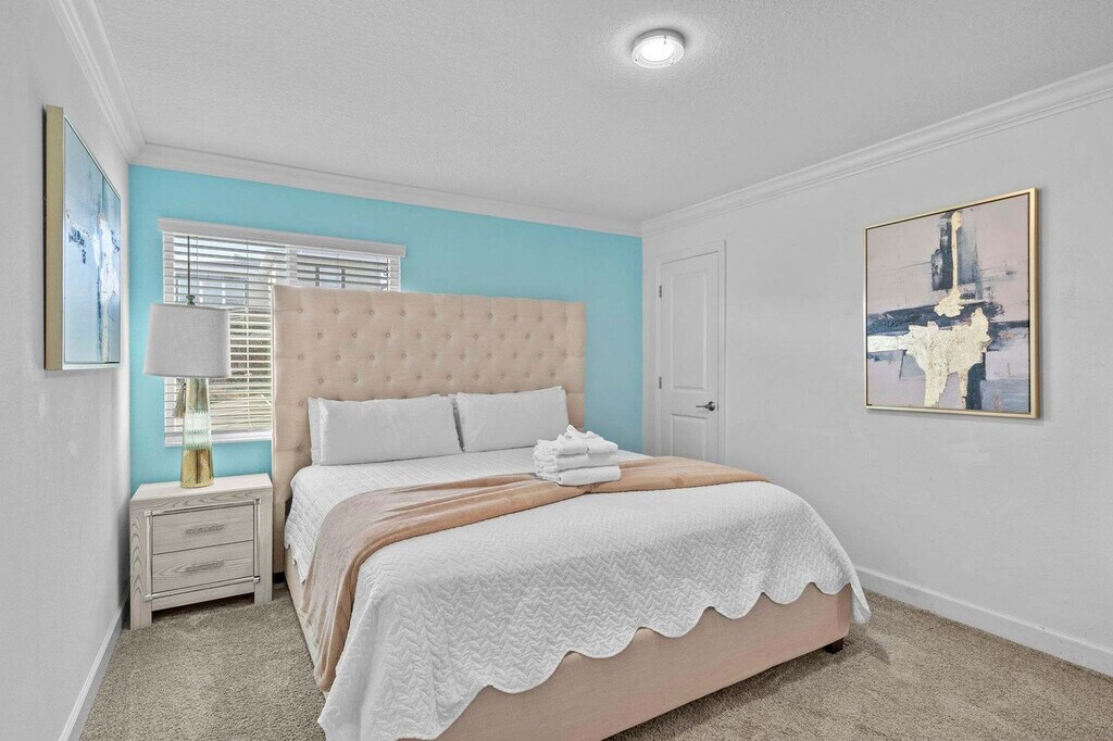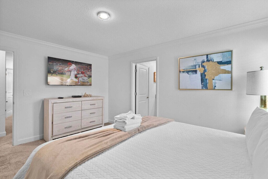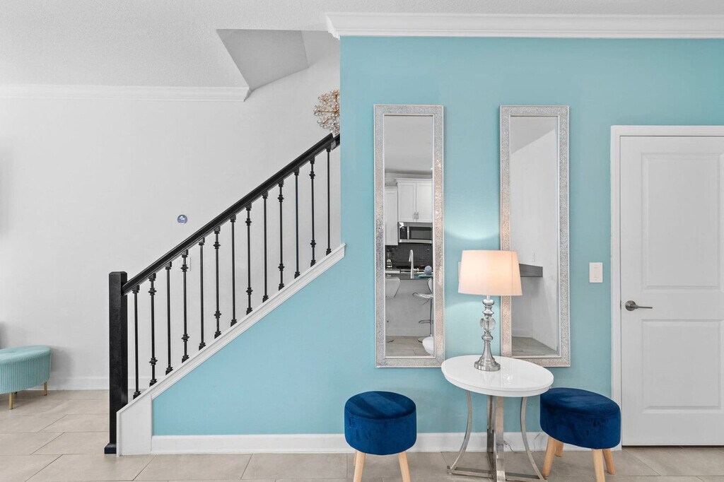 Experience the perfect blend of comfort and space in this welcoming 5-bedroom, 4-bathroom townhome, ideal for up to 10 guests. Located in Champions Gate Resort, this home offers a private pool and a fun Avengers-themed bedroom that everyone will enjoy. With access to resort amenities like pools, a lazy river, tennis courts, and a fitness center, plus a convenient location near markets, restaurants, and shops, it’s the perfect base for your vacation. Discover the perfect combination of comfort, space, and convenience in this inviting 5-bedroom, 4-bathroom townhome, designed to make your family’s stay unforgettable. The open living room flows into the dining area and fully equipped kitchen, creating a welcoming space for relaxation and shared meals. Step outside to enjoy your private, heatable pool on the patio—ideal for unwinding and creating lasting memories. The first floor features two bedrooms sharing a bathroom: one with a queen bed and another Mickey-themed room with two single beds. Upstairs, you’ll find a spacious king master suite, an additional king bedroom with an en-suite bathroom, and a fifth bedroom with two double beds and its own bathroom. For your convenience, the home includes a laundry room with a washer and dryer, complimentary Wi-Fi, and free parking. A welcome kit with essential bathroom and kitchen items ensures a smooth start to your stay. Located in Champions Gate Resort, this home offers easy access to world-class amenities, restaurants, shops, and attractions. Create cherished memories in this perfect vacation retreat—your unforgettable getaway starts here. Heating the pool is a paid service and there is also a fee charged to use the barbecue grill. Champions Gate Resort is a resort-style community that offers every imaginable amenity for a blissful stay. It features an impressive clubhouse with a variety of courts and outdoor activities like tennis, beach volleyball, and a golf course, while its restaurant and fitness center will help you stay refreshed and fit. Its swimming pool complex is perfect for a splashy day, with slides, a lazy river, and a kids splash pool. Plus, the resort is just 20 minutes away from Disney Parks, ensuring plenty of opportunities for fun and adventure. Shopping, dining, and entertainment are also within reach, with stores, restaurants, and supermarkets nearby. It's the perfect place for a family getaway; come and experience all the perks of Champions Gate Resort! Quiet hours are between 22:00 and 8:00. No smoking and pets are not allowed. [SI]