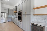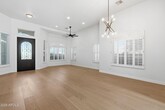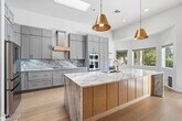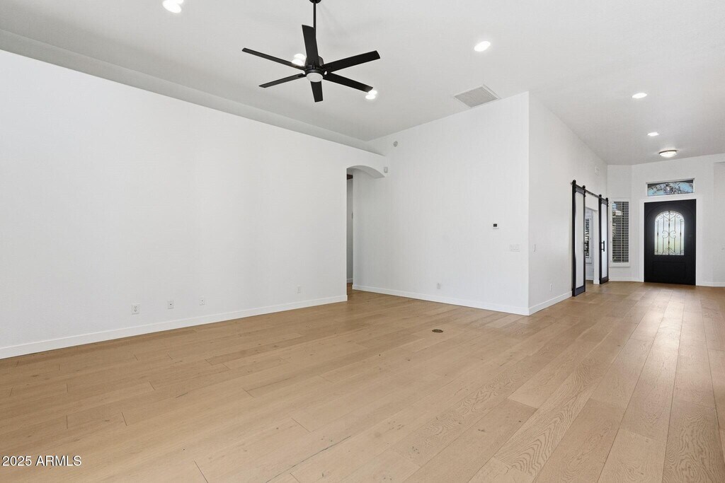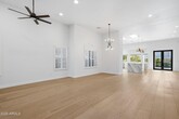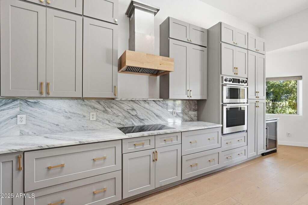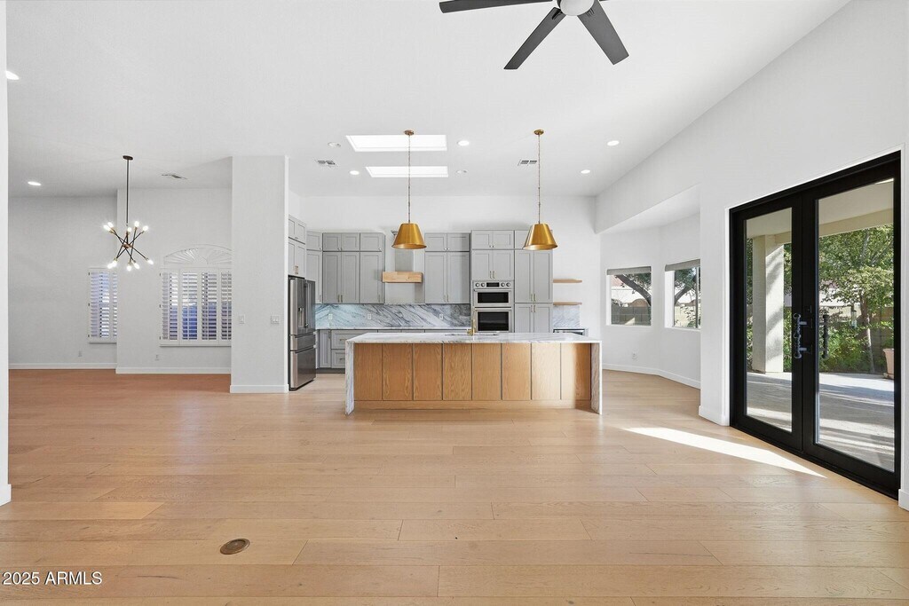 Step into luxury from the moment you arrive,greeted by custom iron doors and soaring 12-foot ceilings. Wide-plank hardwood floors lead you into an open-concept kitchen featuring a massive marble waterfall island,custom cabinetry,double ovens,a marble backsplash,and a beautifully crafted custom hood vent. The oversized master suite offers a true retreat,complete with a spa-like bathroom showcasing a floating vanity,an expansive walk-in shower,a relaxing soaking tub,and dual walk-in closets. A versatile office or bedroom features stunning custom barn doors,adding both character and functionality. Outdoors,enjoy a travertine-covered patio overlooking a huge heated spa with a waterfall feature and a cozy fireplace,perfect for year-round entertaining and relaxation.