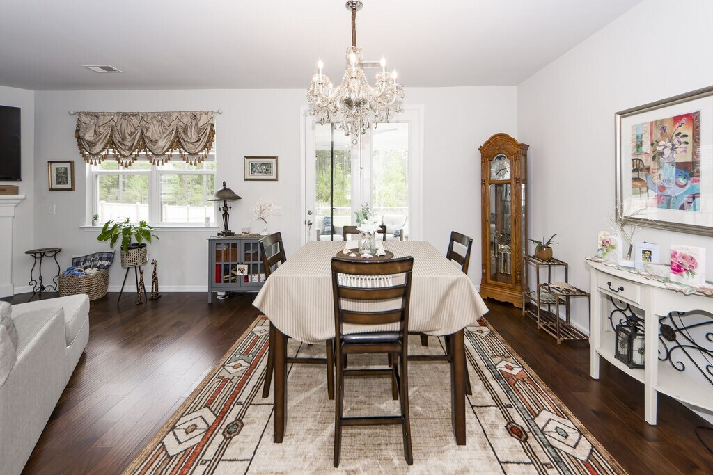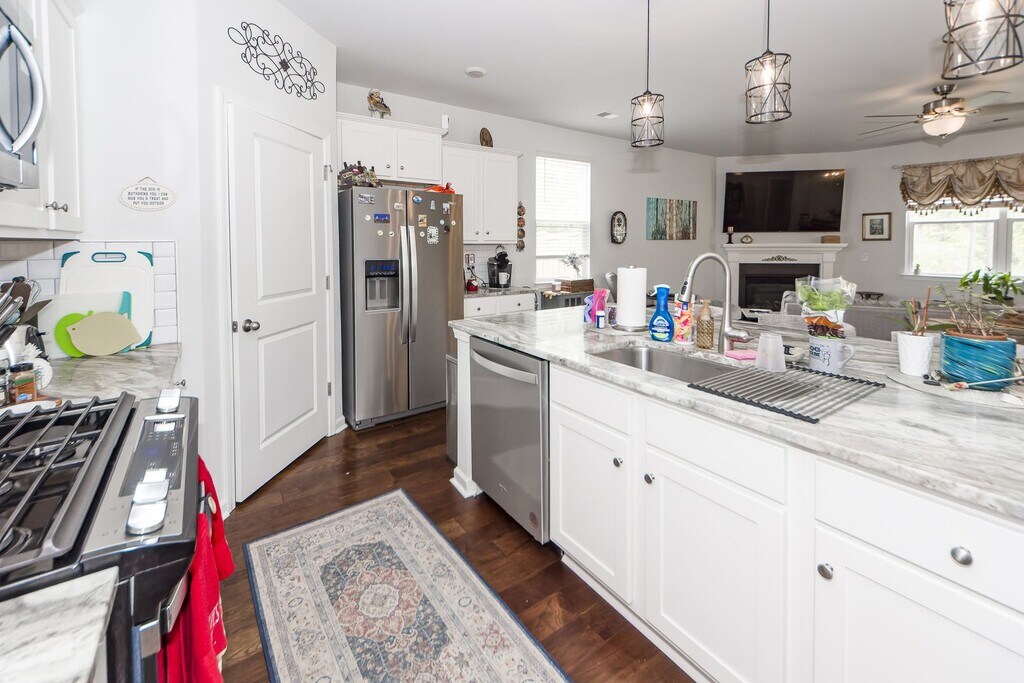 4 Bedroom 2 Bath Home in French Quarter Creek - Huger - 1862 SQFT. - Stunning newer home with combination of vinyl & brick - Large, gorgeous kitchen with beautiful marble countertops, breakfast bar for serving or enjoying a meal, stainless steel appliances & plenty of cabinetry space with pantry for extra storage - Spacious open living room with beautiful wood flooring, cozy fireplace and window offering plenty of natural light - Separate dining area off kitchen - Large master bedroom with walk-in closet - Master bathroom; connected to bedroom offers dual vanities & stand in shower - Separate laundry room - 3 other spacious bedrooms with plenty of closet space - Patio out back for relaxing with family or entertaining - Huge fenced in backyard for activities & pets to play - Scenic lake with walking path for a morning/evening stroll - Pets negotiable