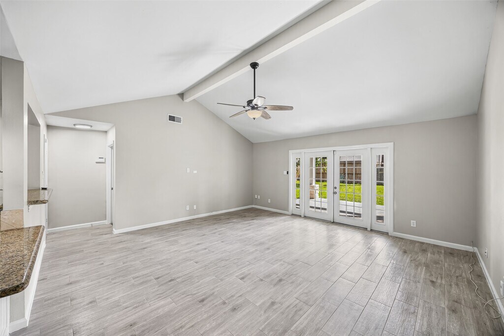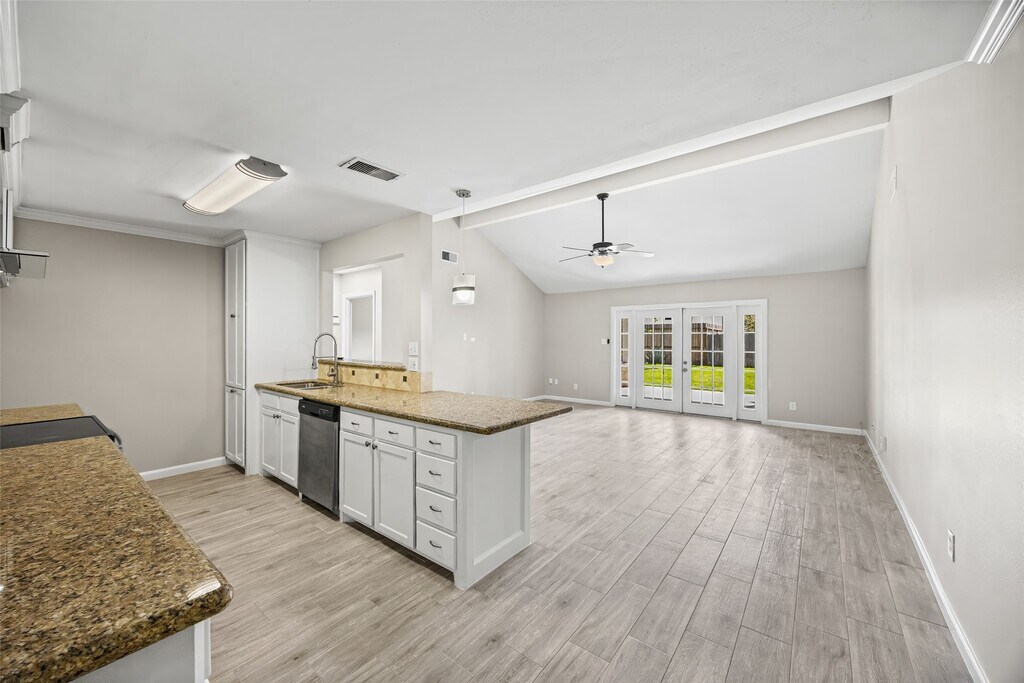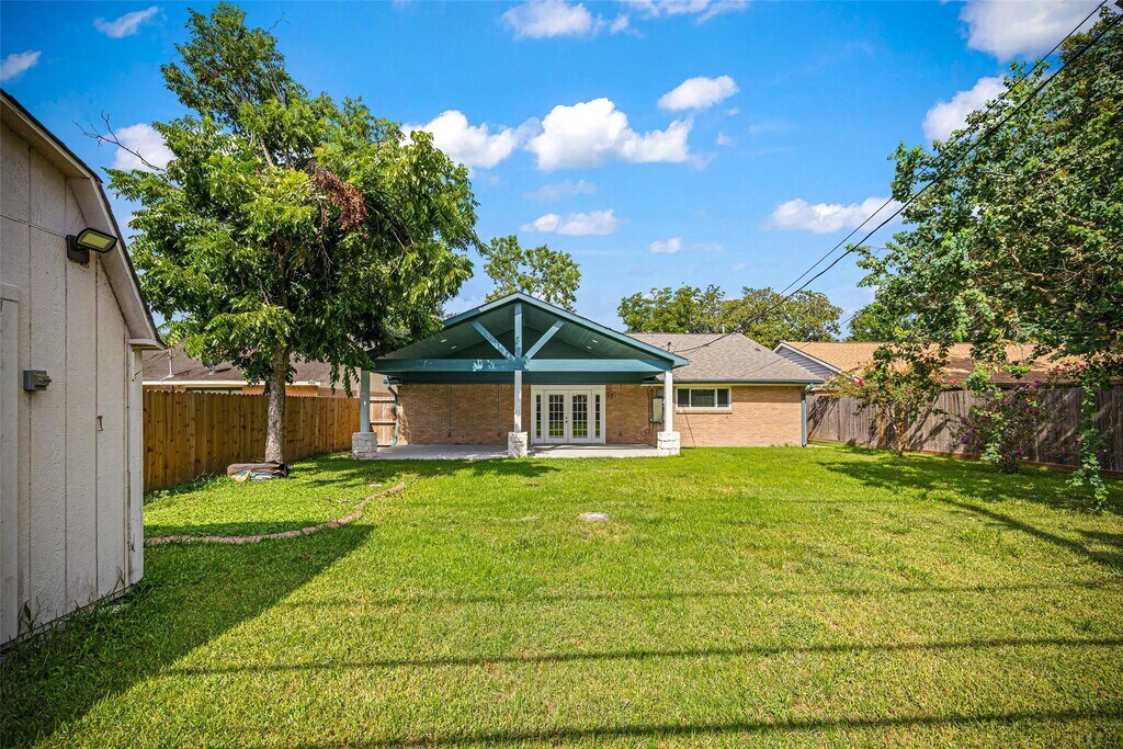 Beautifully renovated single-story home in a convenient Houston location. This property features a bright open floor plan with fresh paint,crown molding,and wood-look tile throughout the main living areas. The spacious kitchen offers granite countertops,white cabinetry,modern backsplash,and stainless steel appliances,seamlessly opening to the living room with vaulted ceilings and French doors. A formal dining area with bay windows adds charm and versatility. The primary suite includes a walk-in closet and a stylishly updated bath with granite vanity and walk-in shower. Secondary bedrooms are generously sized with wood flooring and ceiling fans. Step outside to a large covered patio overlooking a fenced backyard with mature trees and storage shed,perfect for entertaining and everyday living. With quick access to shopping,dining,and major highways,this move-in ready home is a must-see. Schedule your showing today! MLS# 10572728