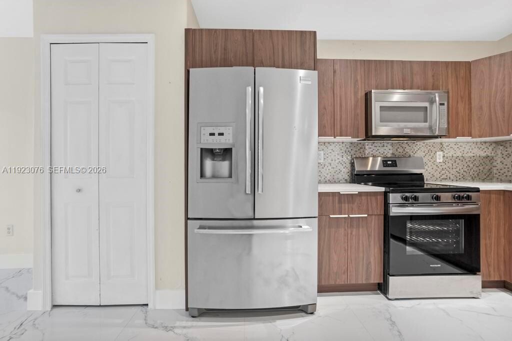 This gorgeous CORNER townhouse in Dimensions at Doral has many fresh upgrades, including NEW FLOORING on the first floor and on the stairs, NEW KITCHEN CABINETS, and a NEW VANITY+MIRROR in the main suite's bathroom. It is a fantastic option in a charming GATED community. The first floor offers a spacious living/family room, a formal dining area with its own window, a kitchen with a large breakfast area and a pantry, a half bath, a storage under the stairs and another storage next to the half bath, and a fenced patio with even more storage there, too! Upstairs, you’ll find the main suite, two more bedrooms and a den, ideal for an office, playroom, or flex space. Every bedroom features custom closets, a ceiling fan and zebra blinds, and the home also has accordion shutters throughout for easy storm preparation. The full size washer and dryer are in the one car garage. This association is about half a mile from NW 41st Street, with quick access to the Turnpike and nearby shopping, dining, Doral's top rated schools, and RIGHT NEXT to the Trails & Tails Park, making it a fantastic option for pet lovers. The owners are accepting tenants with pets. The only association requirement reg. pets is that each pet be registered with payment of $85 pet fee/pet. Once you visit, you’ll appreciate how bright, open, and roomy this corner layout feels. Renter's insurance required. Please note the refrigerator shown in the pictures will be replaced with a brand new unit of a different model. MLS # A11923076