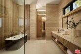 The Glassridge Residence. A Tadao Ando inspired organic modern with walls of glass that open to ocean and Getty views. Privately gated and set along one of Bel Air's most prominent ridgelines, the estate was newly completed in 2025 by Studio MD - AIA, with interiors by James Rosen. The main level is conceived as an open-plan environment with soaring 12' ceilings and sliding glass walls that connect living, dining, and kitchen spaces directly to the surrounding landscape. The kitchen reads like a gallery installation, featuring full-height travertine surfaces, a 15' waterfall island, and seamless, handle-less cabinetry that conceals an integrated Miele appliance suite, including double ovens and a built-in espresso machine. On the top level, a private vestibule with a stone-clad prep bar, integrated sink, and refrigerator precedes the primary suite, creating a quiet transition before the view reveals itself. Designed to honor its breathtaking setting, the bedroom is lined with floor-to-ceiling sliding glass walls that open to a wraparound private terrace, extending the suite outdoors and framing uninterrupted hillside and ocean views. The en-suite bath is resort-caliber, finished in travertine with a freestanding soaking tub, walk-in shower, and custom double floating vanities. A linear skylight draws natural light into the space, while a custom walk-in closet sits adjacent, integrated with matching wood millwork. The lower level is organized as a sequence of architectural moments featuring a linear corridor set against an exposed board-formed concrete wall, left intentionally raw, accented by wide-plank oak flooring. This level includes a private three-tier theater, temperature-controlled wine room, gym and steam shower, bar and lounge area that opens to a separate outdoor deck, all designed as a self-contained environment for leisure, wellness, and entertaining. A fully integrated Control4 system manages lighting, climate, audio, and security. The backyard showcases a 41' infinity pool that visually disappears into the landscape, flowing into a waterfall feature visible from the lower deck below. Lounge areas, dining zones, a built-in Alfa wood-fired pizza oven, grill, and a level lawn are arranged as distinct outdoor settings, all oriented toward the surrounding hills. 1149 Linda Flora Drive stands apart as an architecturally distinguished estate thoughtfully designed for privacy and wellness. MLS# 26673077