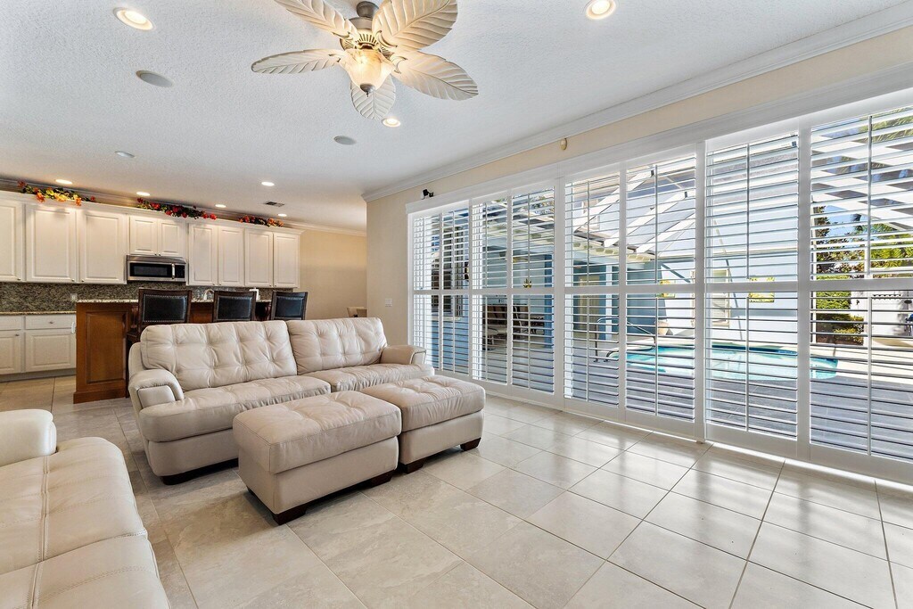Welcome to this beautiful fully furnished Martinique home. All utilities are included! Featuring wood floors, granite counter tops in the kitchen, stainless steel appliances, crown molding and plantation shutters throughout. This gorgeous home offers a formal dining room, office/den, and an open floor plan kitchen as the perfect space to entertain and cook. The adjoining large family room opens up to a private courtyard patio with a screened in pool for plenty of room to entertain, play and lounge. The upstairs offer a large owners suite and 3 additional bedrooms. This home offers plenty of outdoor space with an large upstairs balcony, front porch and an extra large green area in front of the home.