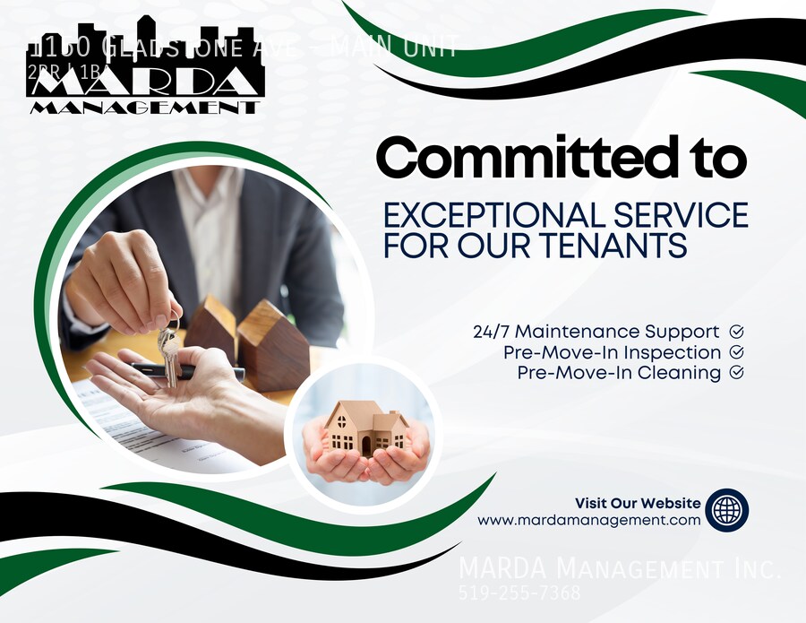 ** 1/2 MONTH FREE RENT IF LEASE SIGNED BY MARCH 31, 2026!! ** Welcome to your new home at 1150 Gladstone in the desirable Walkerville neighbourhood, where classic charm meets modern convenience in this spacious 2+1 bedroom, 1 bathroom main floor unit. This bright and welcoming living area features elegant hardwood floors throughout, perfect for both relaxation and entertaining. The well-sized bedrooms, plus an additional den, offer flexibility for a home office or guest room, while the stylish three-piece bathroom meets all your daily needs. The large attic space provides extra storage or a creative area for your hobbies. Step outside to the shared fenced backyard ideal for outdoor activities and gatherings. With convenient street parking, you'll have no worries about parking. Located in Walkerville, you're close to local amenities, dining, and entertainment options. Tenants are responsible for 60% of hydro, water & gas. Non-smoking unit. First and last months rent and a credit check are required. One-year minimum lease. Professionally managed by MARDA Management, offering 24/7 maintenance support with a live agent and easy, convenient rent payment options. Call MARDA MANAGEMENT today at or email to schedule your viewing. Additional Media: Fenced Back Yard Freshly Painted Front Porch New Countertop Installed No Smoking Allowed Pet Friendly Shared Back Yard