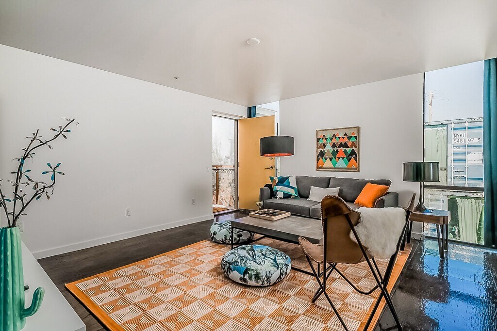 Welcome to Containers on Grand - Live at the coolest building in Phoenix - Featured in Dwell Magazine, these luxury residences are comprised of two open containers each, plus additional space, for a total of 740 square feet, with full 8 foot ceilings, large modern windows, full kitchens, in-unit washer/dryer, built-in desk, closet/storage areas, and beautiful glossy marine grade hardwood flooring. Completed in 2015, these units are extremely eco-efficient compared to traditional apartment buildings with spray foam insulation on all sides of the unit. Smart thermostat, electronic entry, & wall mounted HD Smart TV are included! This gated community is in a convenient downtown location in the Grand Ave Arts District, with lush landscaping and a common area BBQ Grill + Patio.