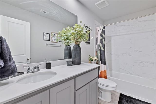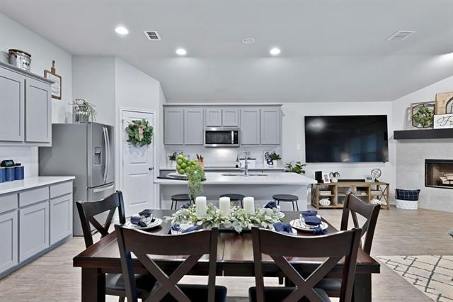 This beautifully maintained 4 bedroom, 2 bath home offers a perfect combination of comfort, style, and functionality in a desirable Aubrey community. Designed with entertaining and everyday living in mind, the home features a spacious open-concept layout with a large living area, elegant fireplace, and abundant natural light. The chef-inspired kitchen includes granite countertops, stainless steel appliances, generous cabinetry, and a large center island, all open to the dining and living areas ideal for hosting guests or enjoying family time. The private primary suite provides a relaxing retreat with a spa-like bath featuring a walk-in shower, soaking tub, and dual vanities. Two additional bedrooms offer flexibility for guests, family, or a home office. Enjoy the private fenced backyard and covered patio, perfect for relaxing or entertaining outdoors. The home also includes a 2-car garage, modern finishes, and thoughtful design throughout. Conveniently located near shopping, dining, parks, and major commuting routes, this home offers both tranquility and accessibility.