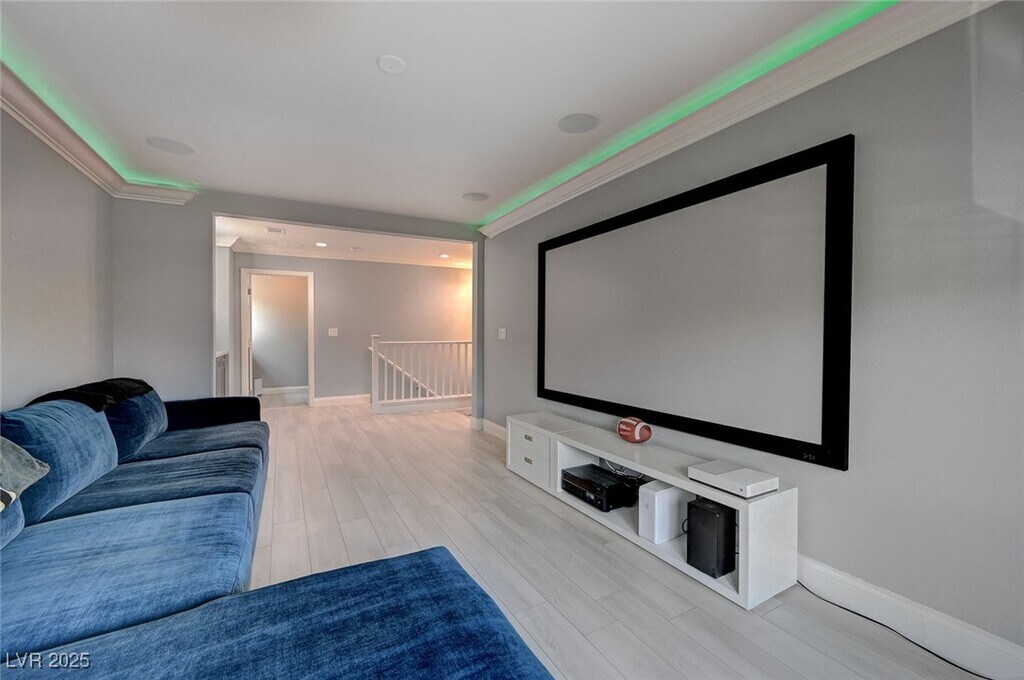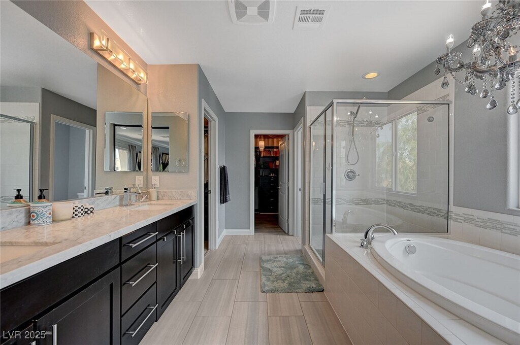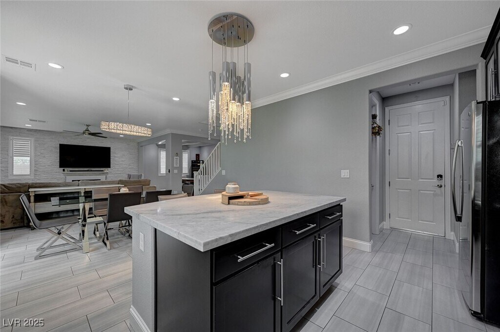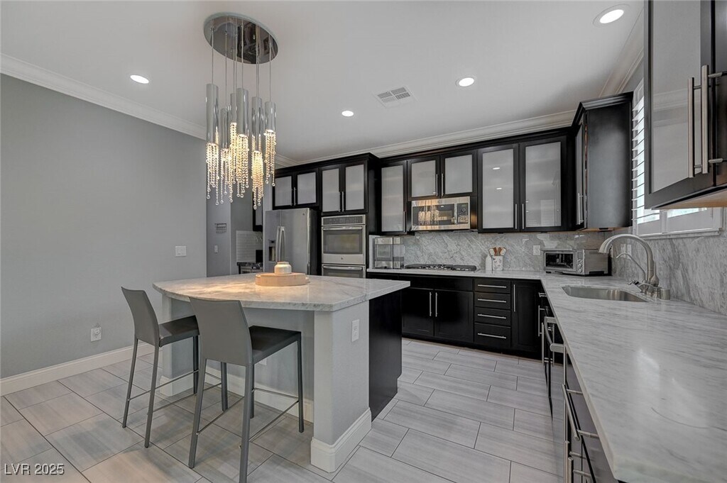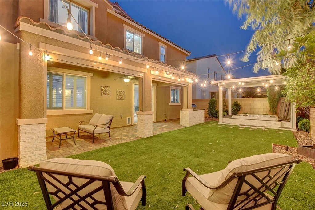 Welcome to this stunning Southern Highlands home featuring 4 bedrooms, 3.5 bathrooms, plus an office, den, or optional 5th bedroom downstairs. Designed with modern elegance, this open-concept layout showcases a white stone feature wall in the great room, upgraded chandeliers, and marble counters throughout. The chef’s kitchen is a true showstopper, complete with a built-in wine fridge, oversized pantry, brand-new dishwasher, five-burner range, and a large island perfect for entertaining. Enjoy stylish living with porcelain tile and luxury vinyl flooring—no carpet anywhere. Shutters downstairs and blackout shades upstairs add comfort and privacy. A movie lounge with built-in speakers creates the ultimate entertainment space, while the primary suite offers dual closets with custom built-ins. Step outside to an entertainer’s paradise featuring a built-in fire pit, chef’s BBQ with fridge, Zen fountain, string lights, and a pergola-covered hot tub. Solar paid by Owner.