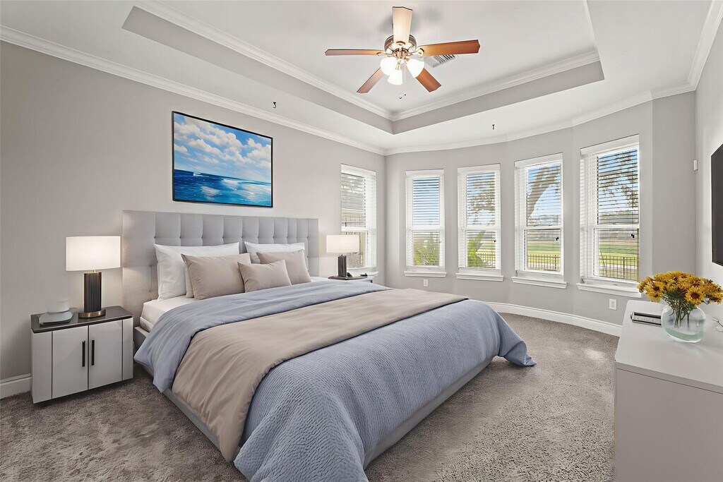 This five-bedroom,three-and-a-half-bathroom house offers approximately 3,488 square feet of living space. The spacious exterior features low-maintenance landscaping and an inviting entryway,welcoming you into the home. The kitchen is spacious with abundant cabinetry and granite countertops,providing ample storage and preparation space. Vaulted ceilings throughout the home create a sense of openness and allow for abundant natural light to fill the living areas. Hardwood flooring extends throughout the first floor,adding a touch of elegance. Each room is thoughtfully designed with a spacious layout,and many feature tray ceilings and a neutral color palette. The primary bedroom offers a luxurious bathroom,while the additional bedrooms provide ample space for guests to include a home office. The spacious outdoor area and beautiful sunsets offer scenic views,create a serene and peaceful atmosphere. Complete Access to the community pools/splashpad with your stay!! MLS# 32580519