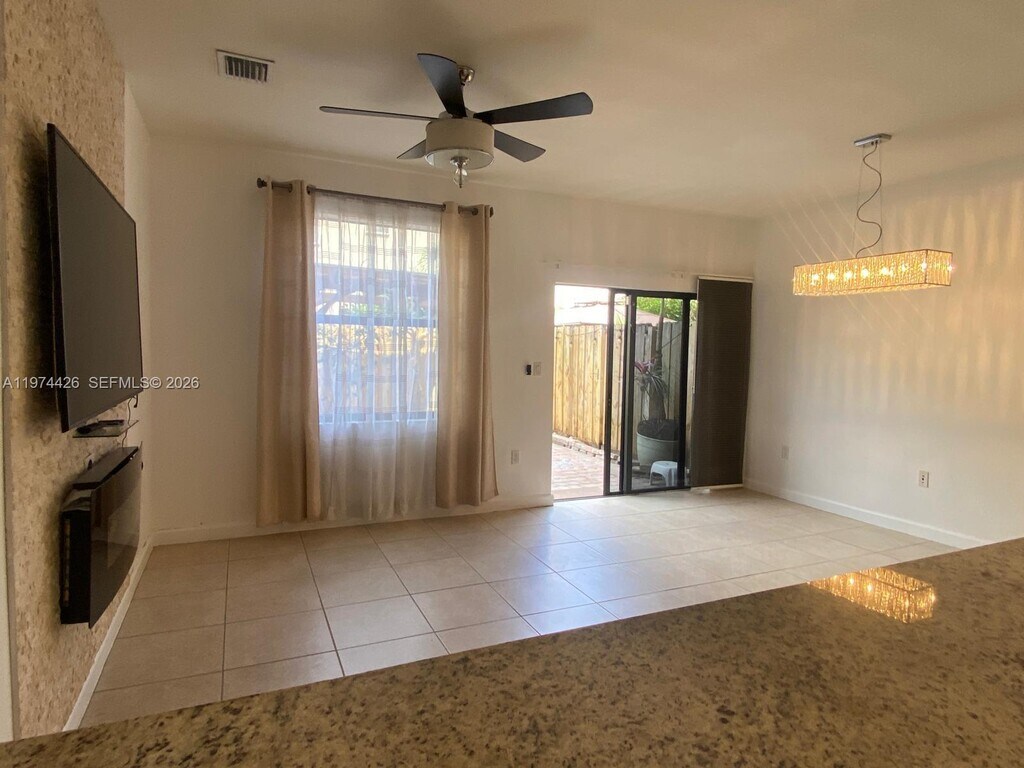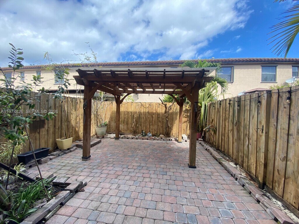 Beautiful townhome in Artesa at Coco Palm Estates in Homestead (Exit 9B Turnpike) featuring a spacious living room with fireplace, bar, and mounted TV, upgraded kitchen with stainless steel appliances and granite countertops, half bath on the first floor, storage under the stairs, and a versatile den ideal for a home office or additional living space. Upstairs offers 2 bedrooms, 2 full bathrooms, and in-unit washer and dryer, plus a private backyard with gazebo/pergola perfect for entertaining. Hurricane shutters installed. Townhome located in a gated community with resort-style amenities including pool, jacuzzi, clubhouse, gym, basketball and volleyball courts, beautiful lakes, fountains, walking trails, guest parking. 2 two assigned spaces in front of the property. Easy access to the Florida Turnpike, near supermarkets, shopping, restaurants, and schools. *Furnishings are digitally staged and for illustrative purposes only. MLS # A11974426