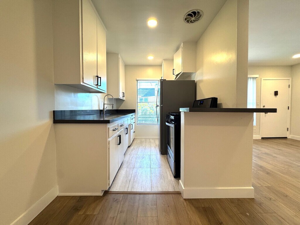 **Permitted Street Parking**, Top floor unit, Laminate and tile flooring throughout, Updated kitchen with quartz counters and stainless steel appliances, Refrigerator and stove included, Updated bathroom with marble vanity, Recessed lighting, Air conditioning, Walk-in-closet in bedroom, Plenty of storage cabinets, Laundry on-site, Online Rent Payments, Available Immediately!
